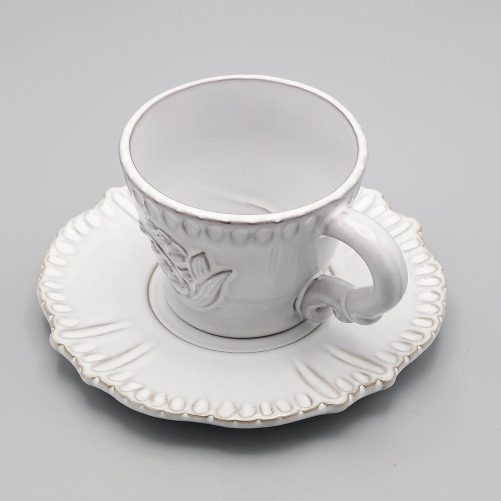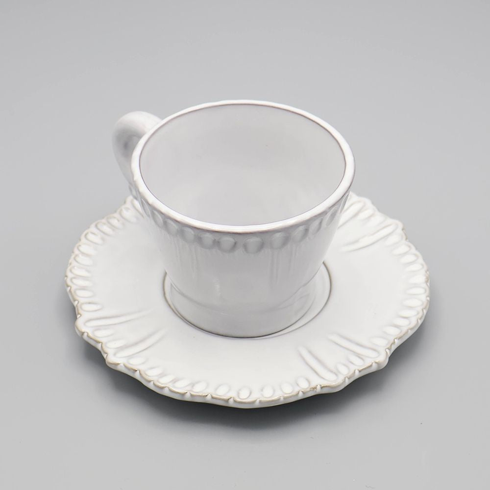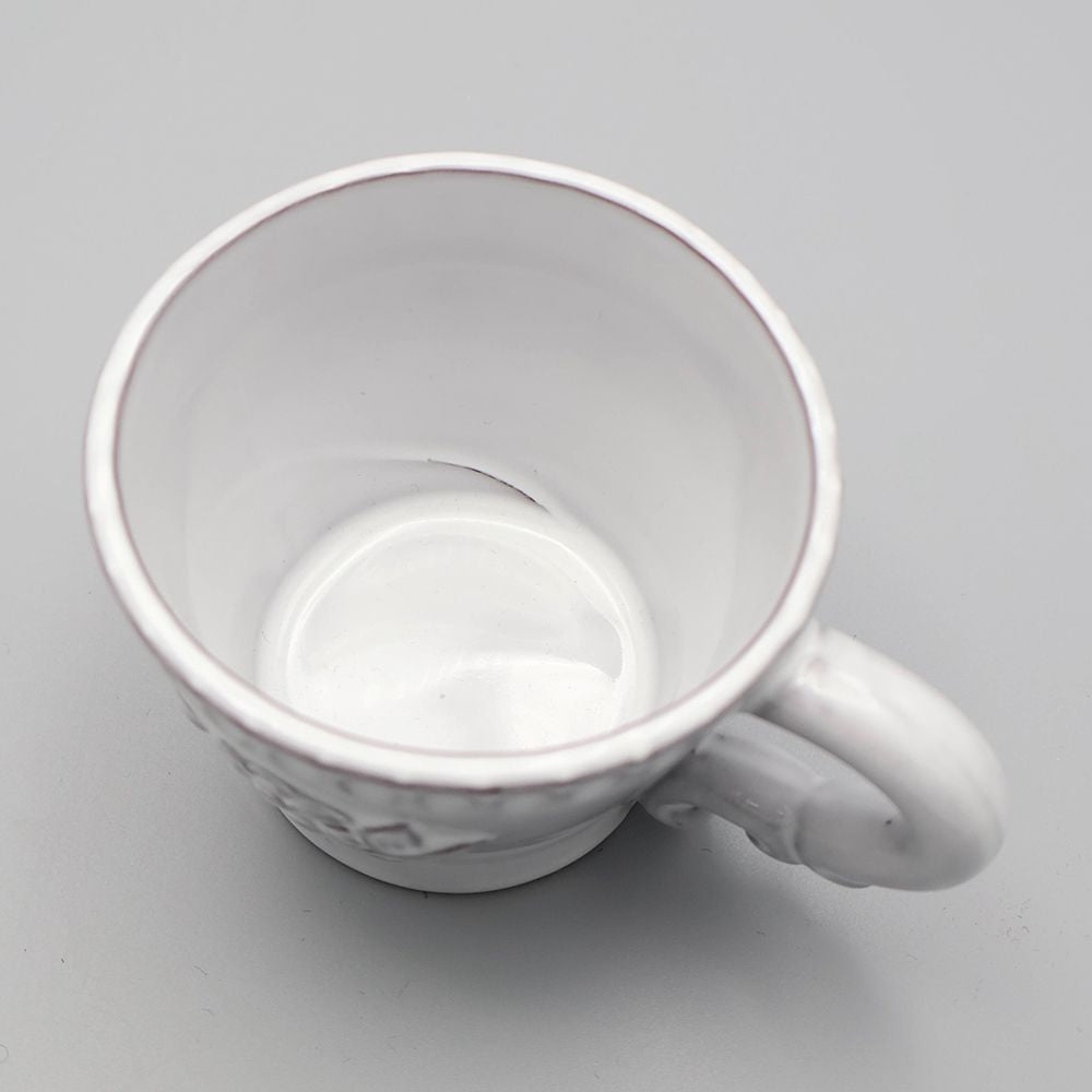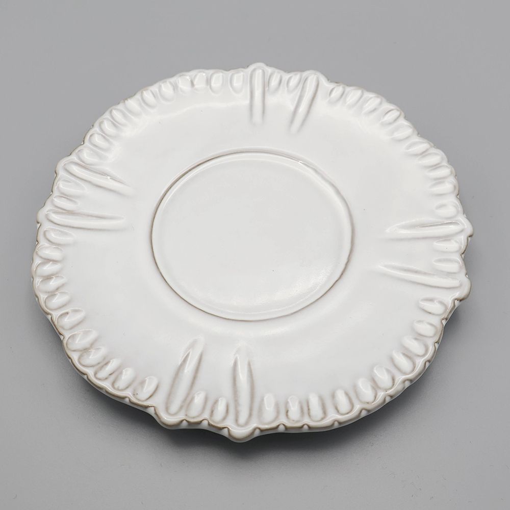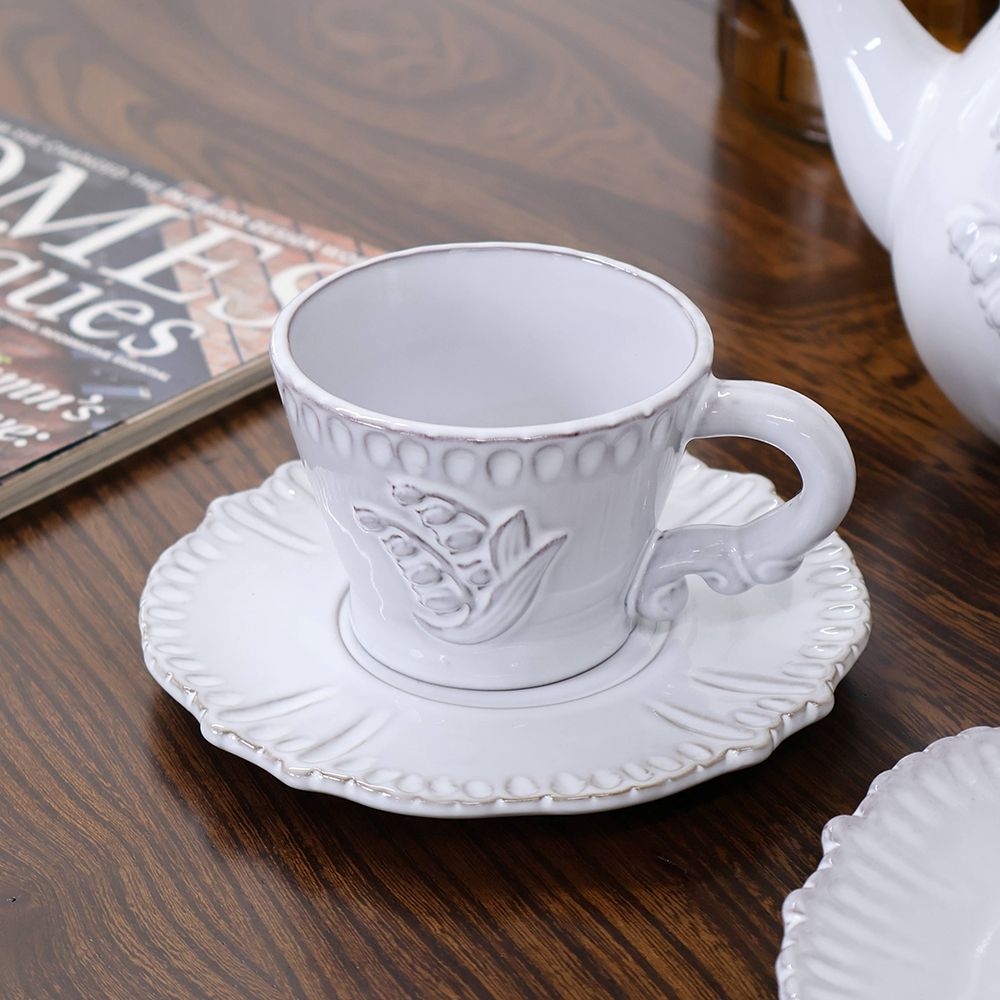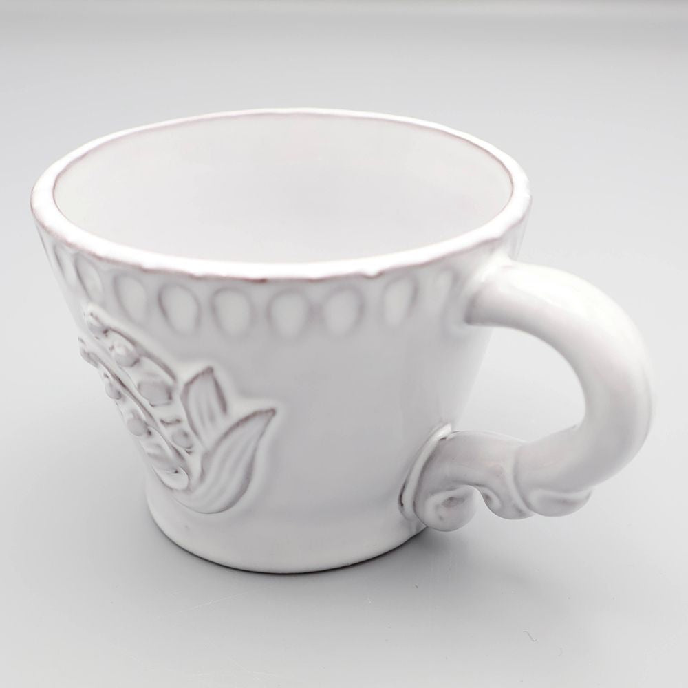 可憐さの中にほんのりクラシカルな気配があり、テーブルに置くだけで景色がやさしく整います。立体的な装飾が縁にやわらかな表情を添え、手にしたときの丸みのあるフォルムも魅力。