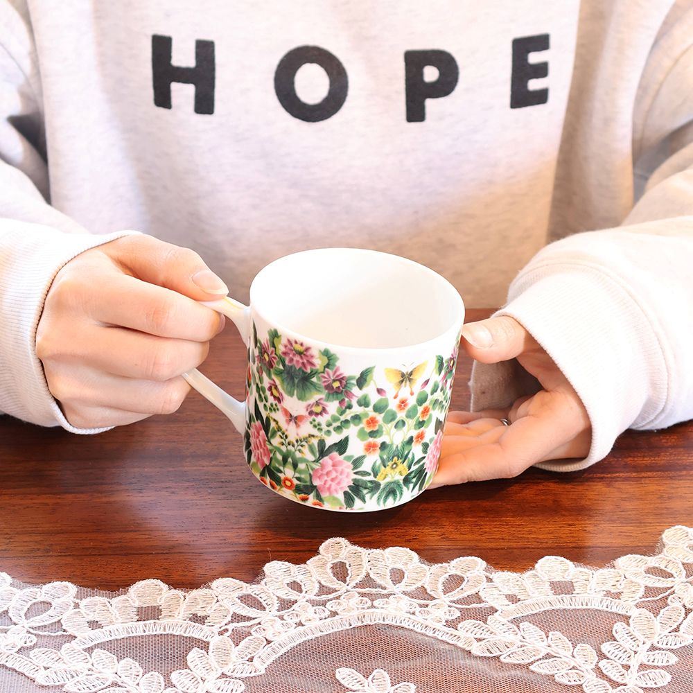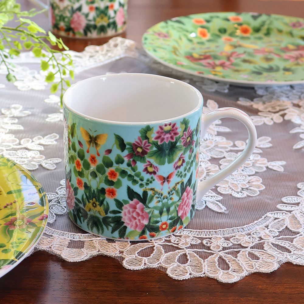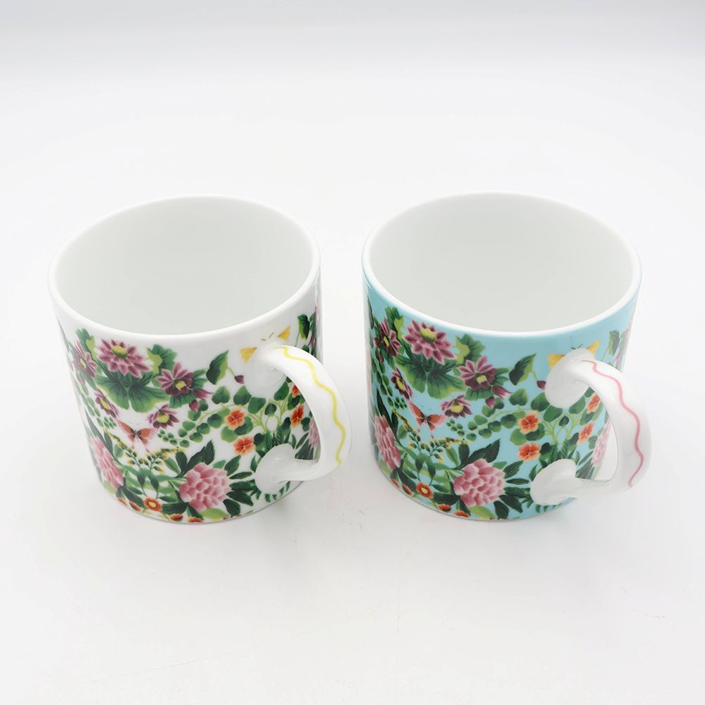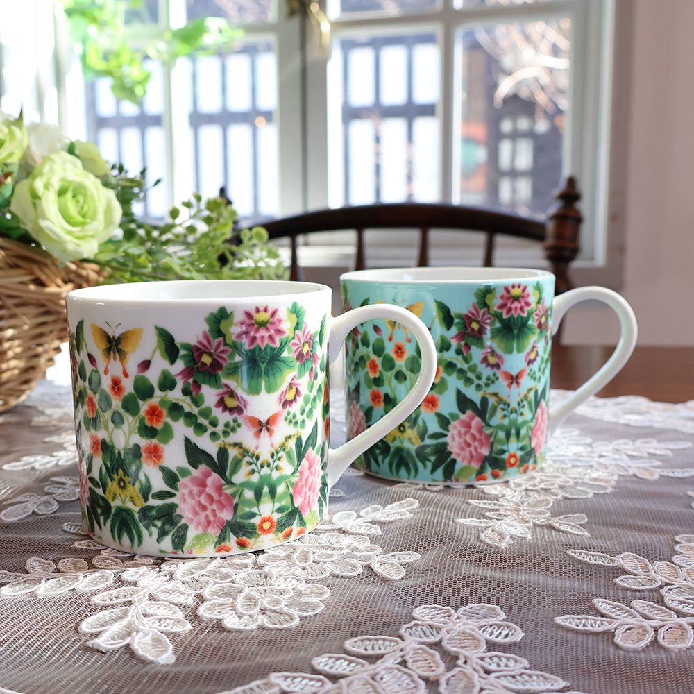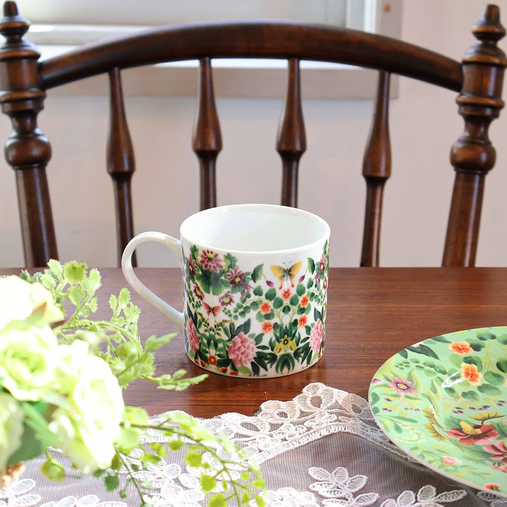 生命力あふれるマグカップの2客セットです。水彩画のような繊細なタッチで描かれた蝶や花々は、眺めているだけで明るい気持ちを運んでくれそうですね。