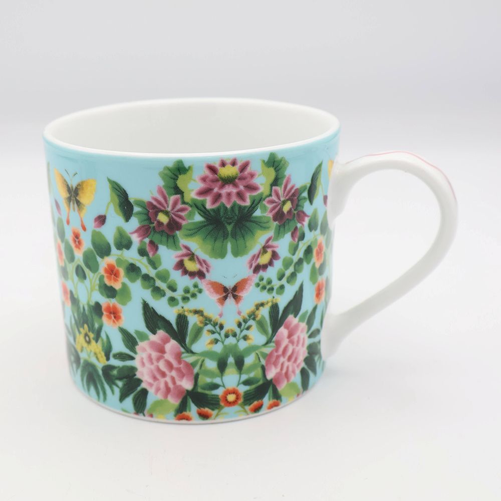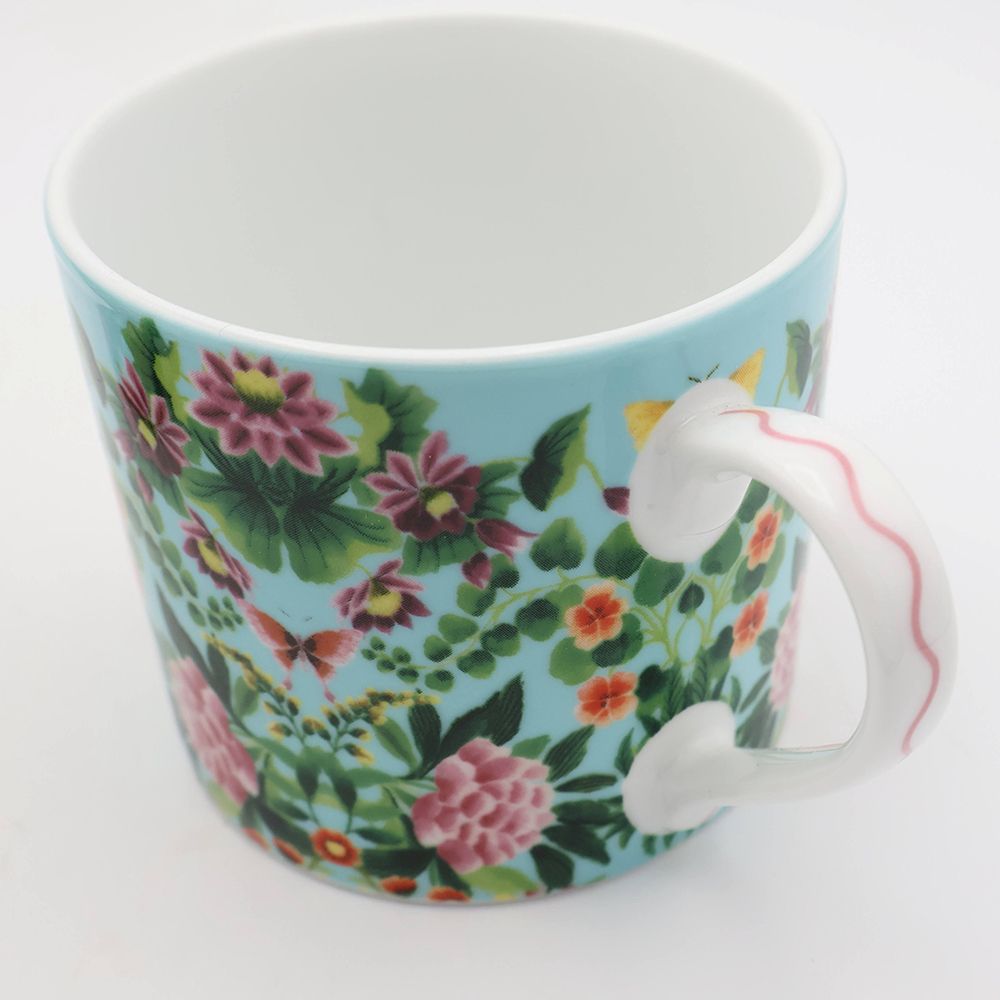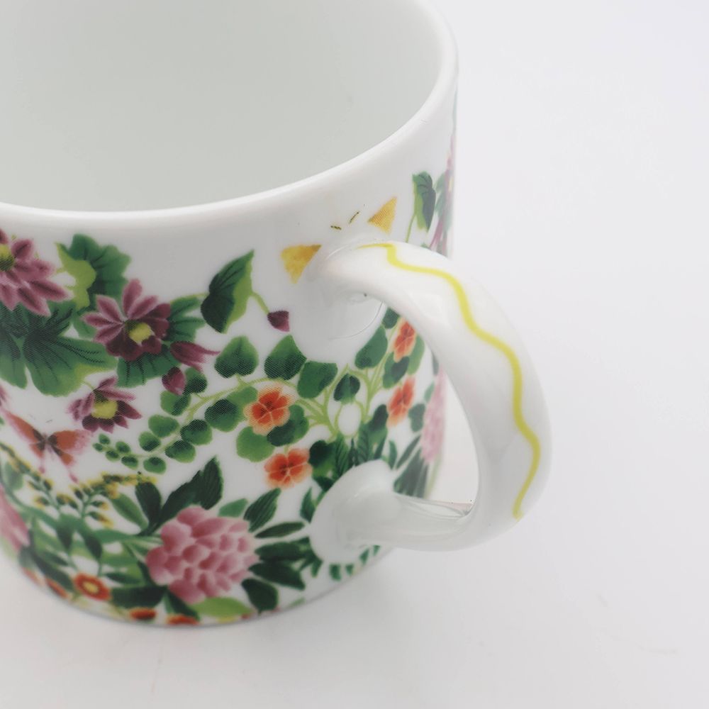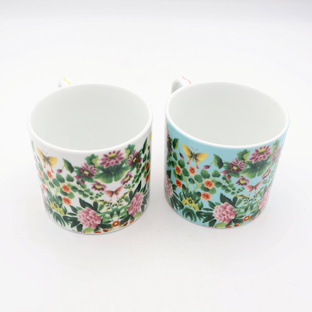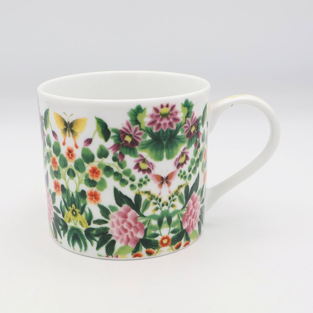 生命力あふれるマグカップの2客セットです。水彩画のような繊細なタッチで描かれた蝶や花々は、眺めているだけで明るい気持ちを運んでくれそうですね。