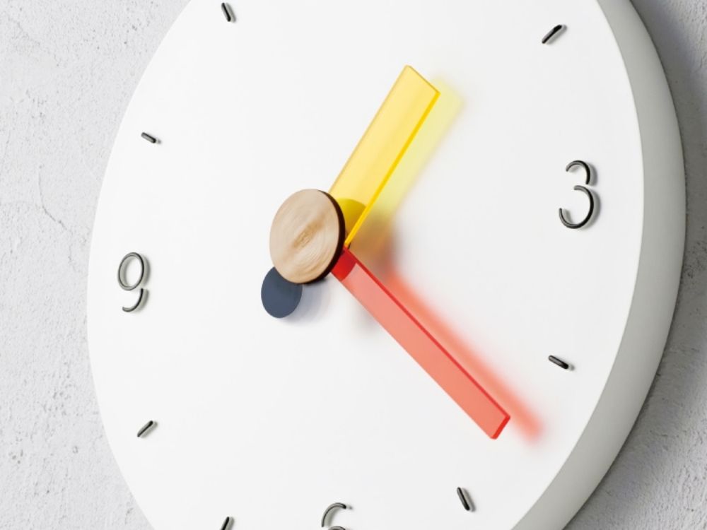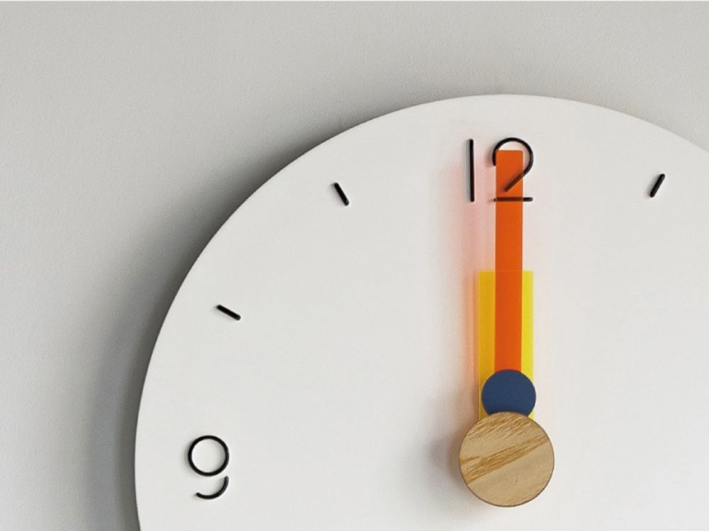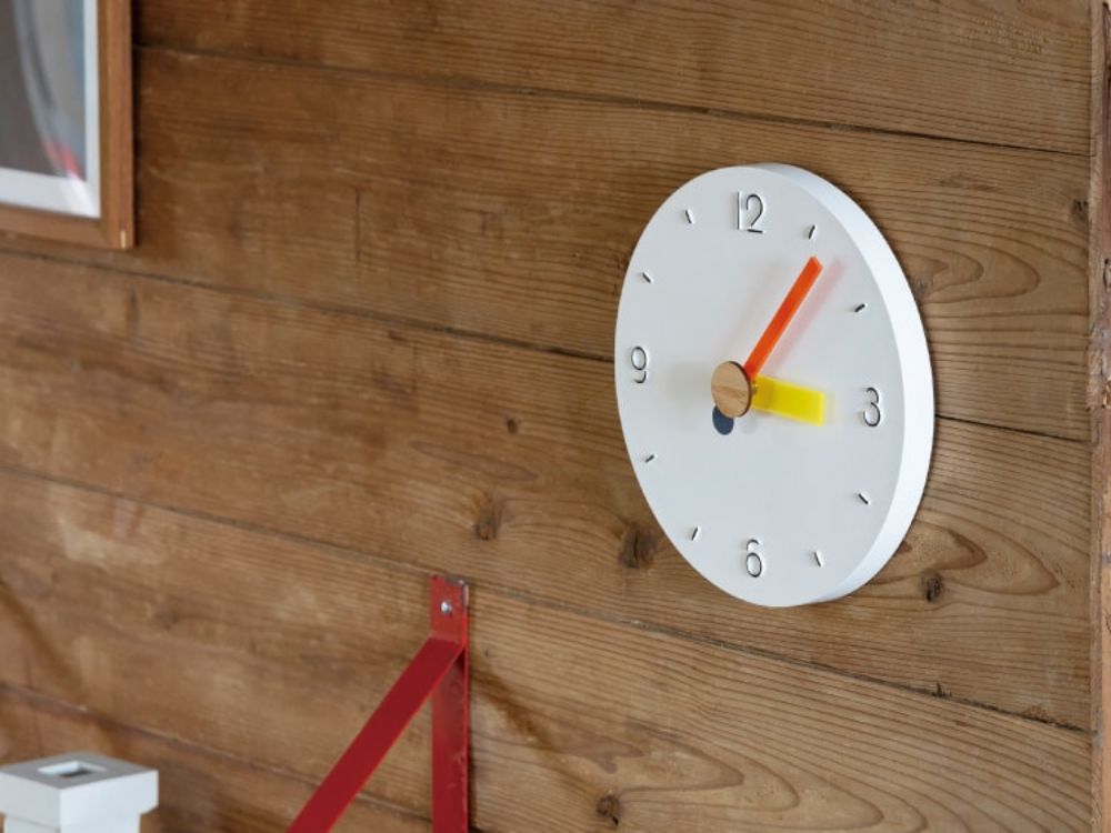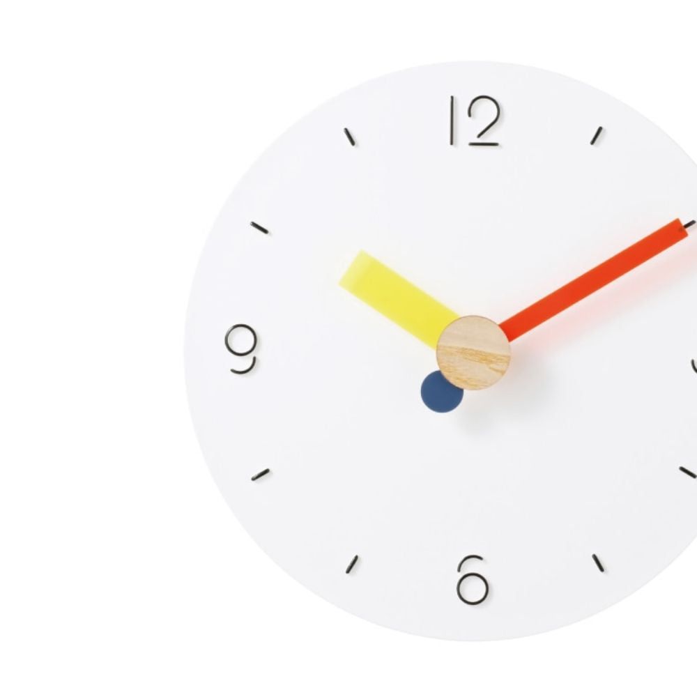 ジオメトリックな数字や短く丸い秒針、そしてリベットにはウッドを添えて、楽しさが弾むようなルックスに。