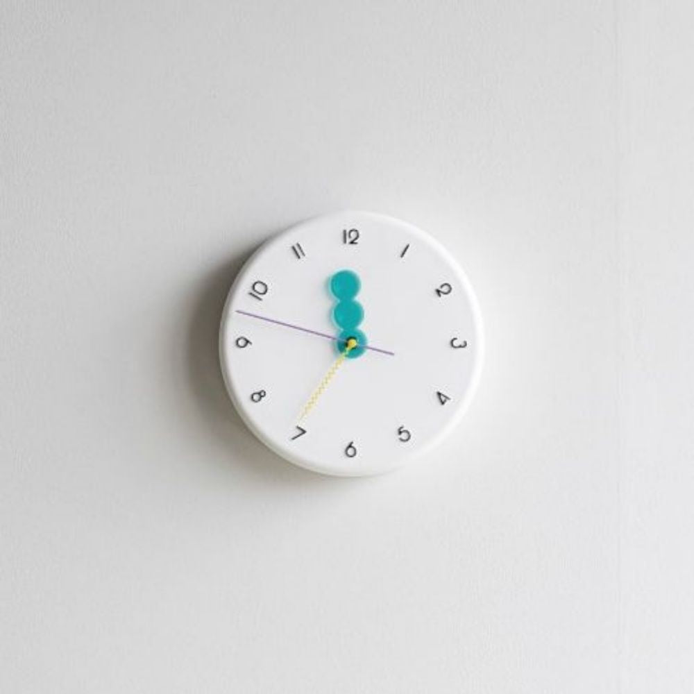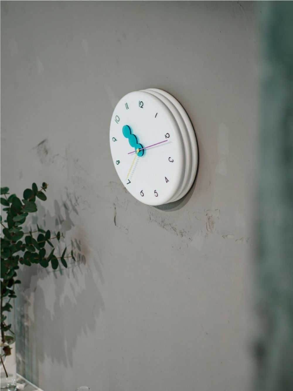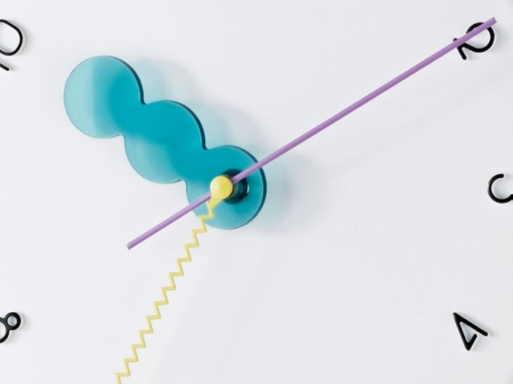ふっくらとしたパンケーキを重ねたようなモコモコの文字盤に、◯◯◯の短針とギザギザの秒針、そして80年代を思わせるビビッドなカラーリングでレトロポップな装いに。