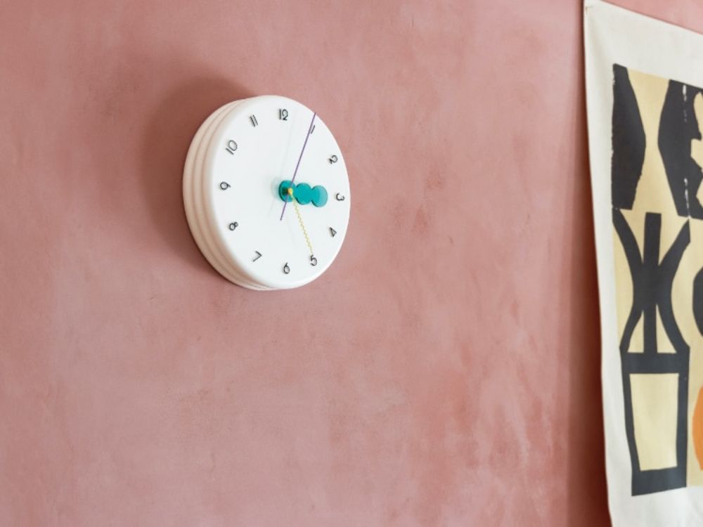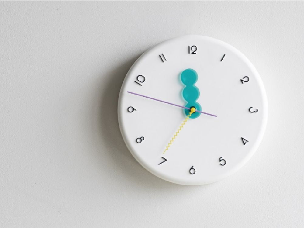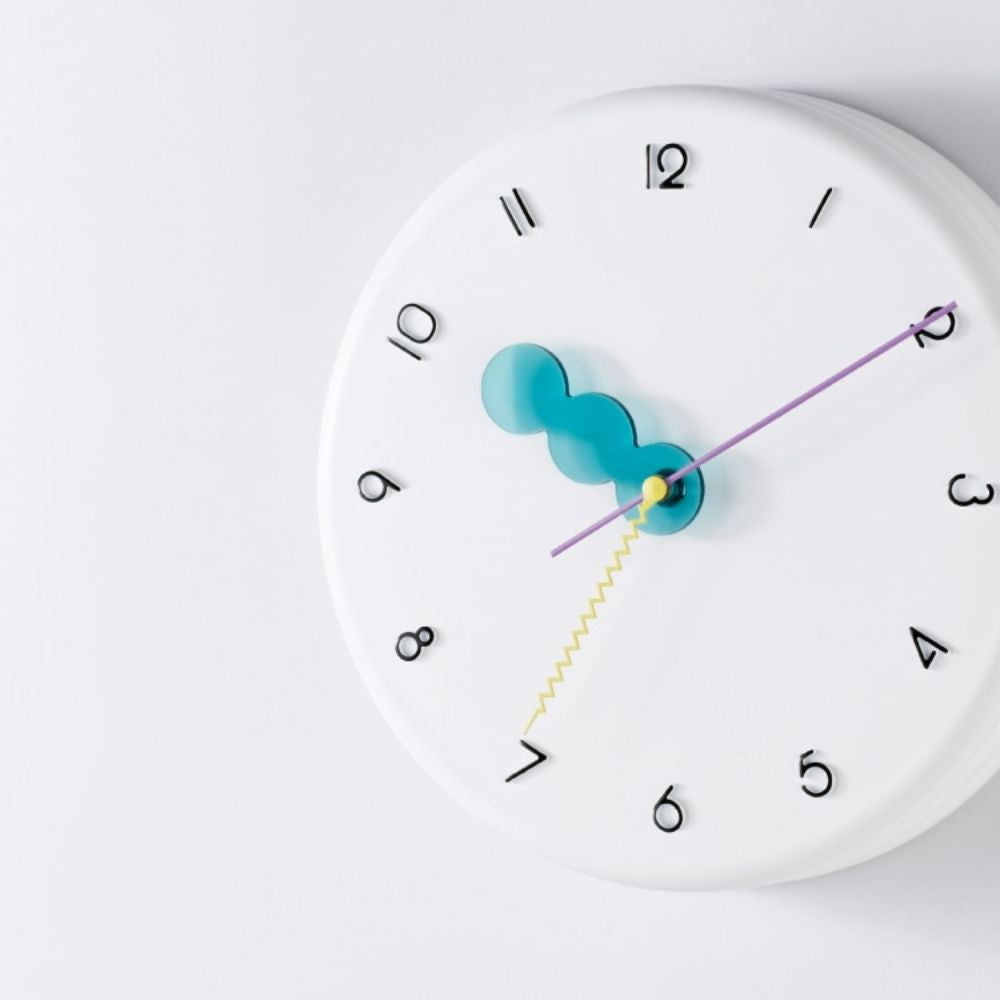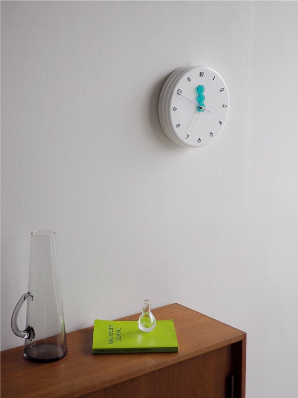 ふっくらとしたパンケーキを重ねたようなモコモコの文字盤に、◯◯◯の短針とギザギザの秒針、そして80年代を思わせるビビッドなカラーリングでレトロポップな装いに。