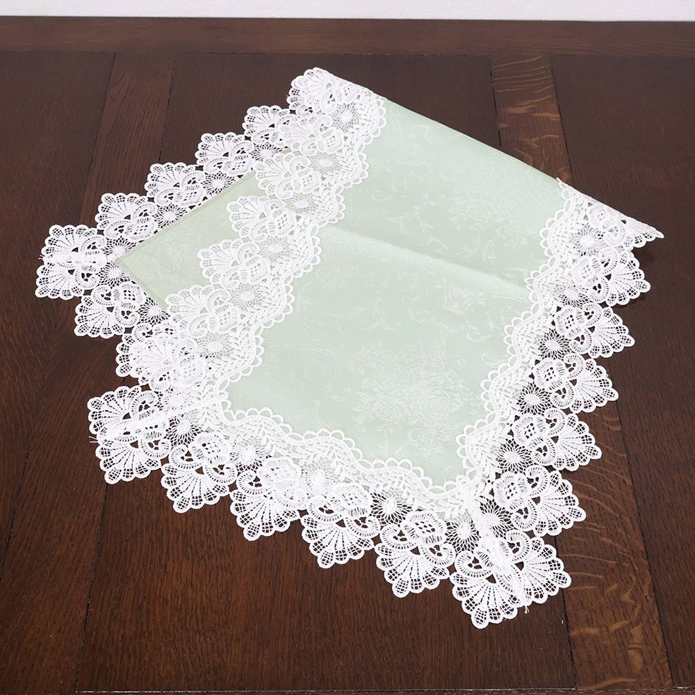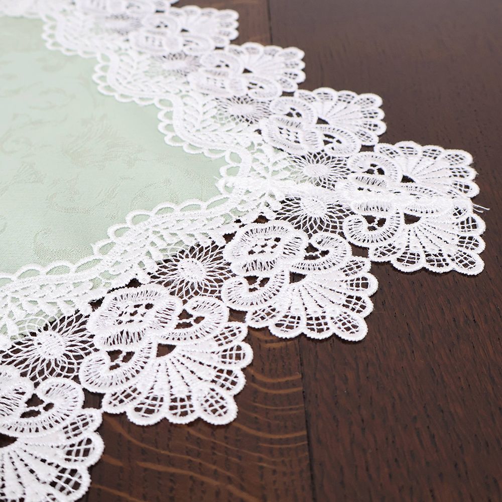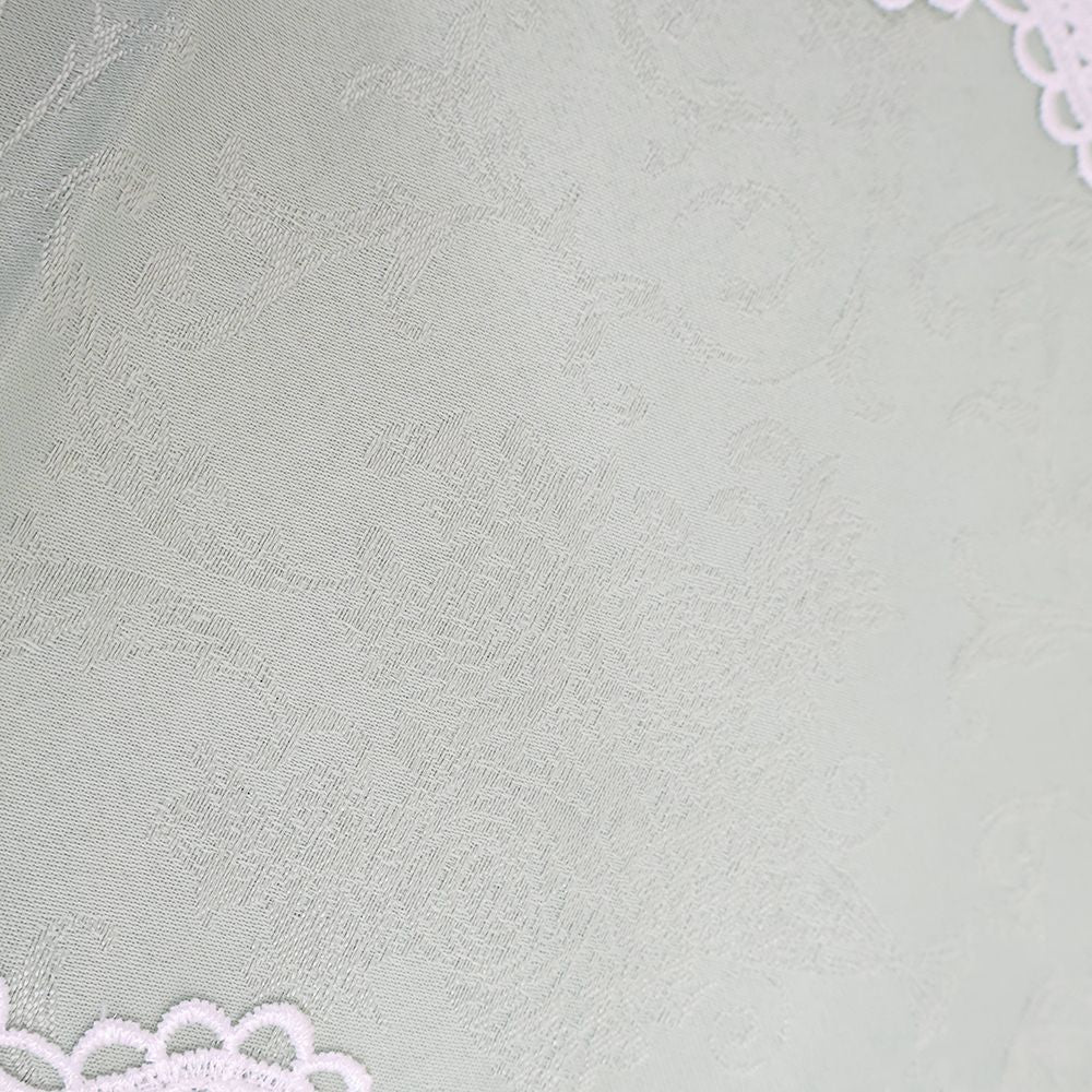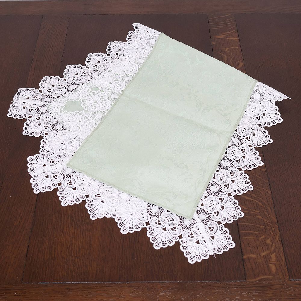 幅80センチほどのテーブルセンターは、ギュピールレース(立体的な機械レース)で丹念に縁取られてクラシカルな仕上がりに。布地は淡いシャイニーリケン色(淡いブルーグリーン)の生地で、バラの織り模様が入った、甘くロマンティックなテーブルセンターです。