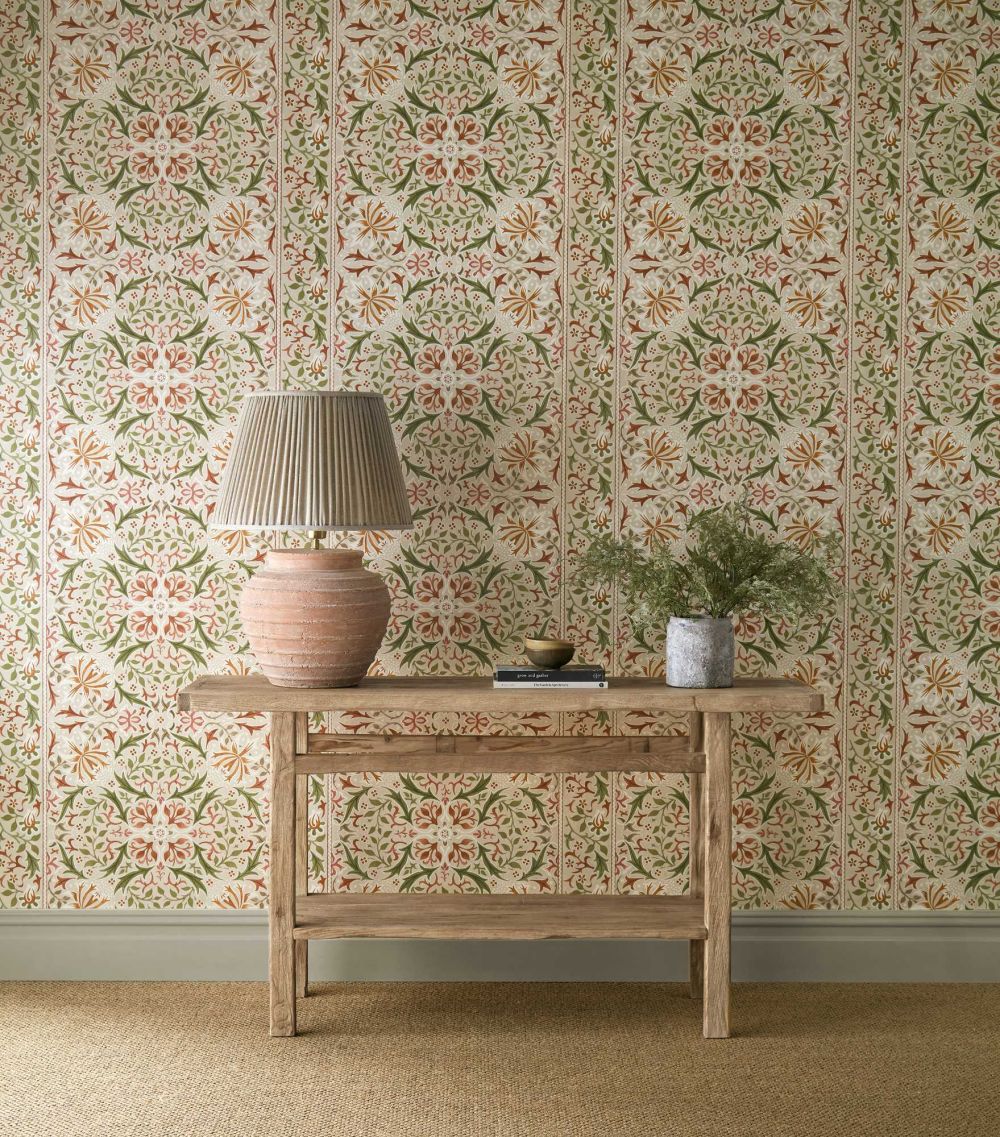 デザインチームは、19世紀の典型的なスタイルである左右対称の鏡像(ミラーリング)を取り入れることで、この模様を美しく再現しました。ハニーサックル、デイジー、そしてアカンサスの葉が渦巻くように重なり合い、印象的なリピート模様を描き出し、その縁をチェッカーボード(市松模様)のボーダーが引き締めています。