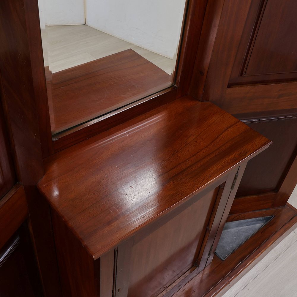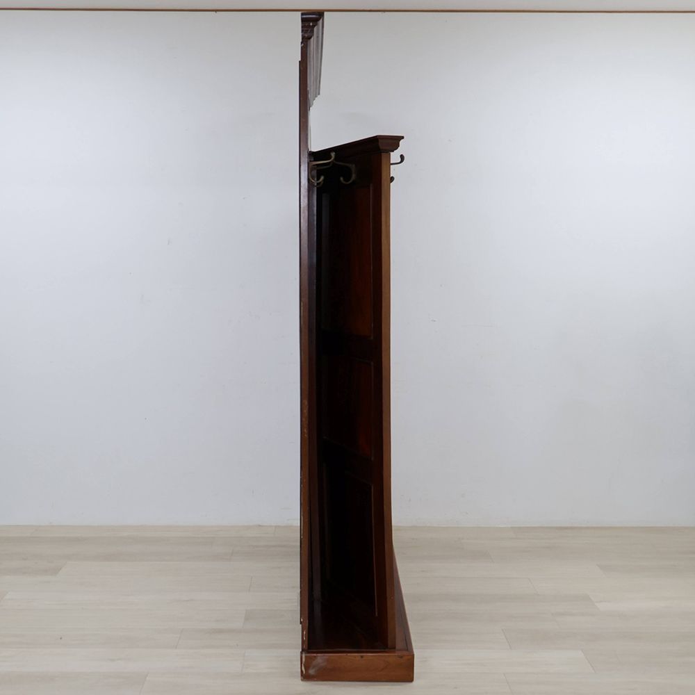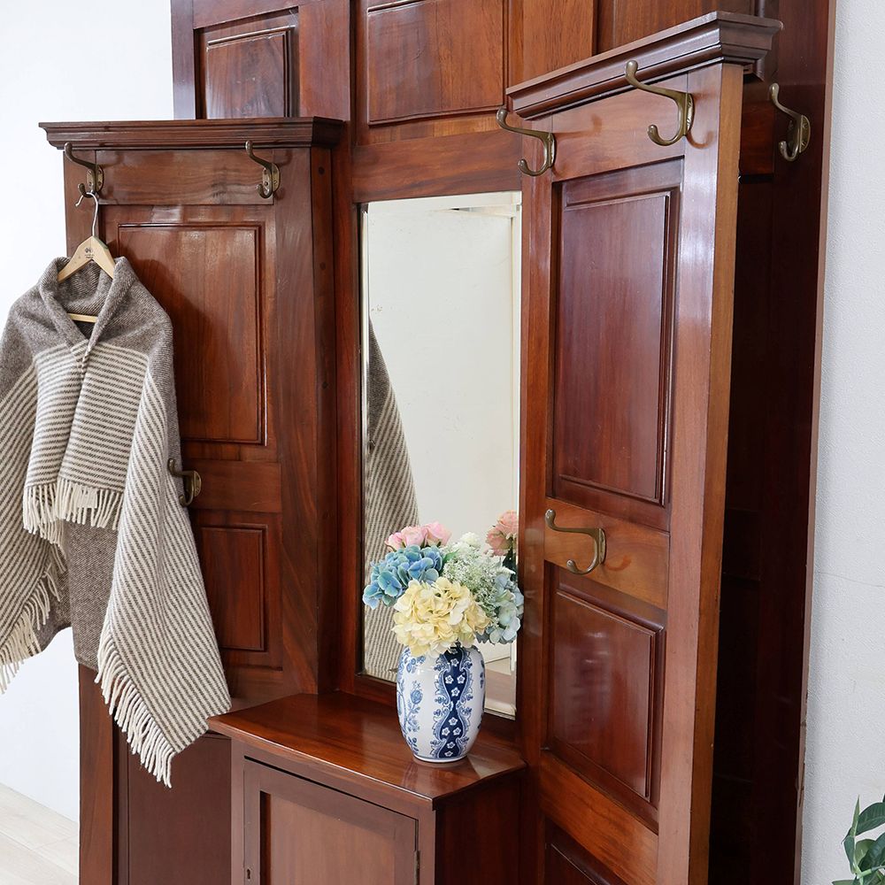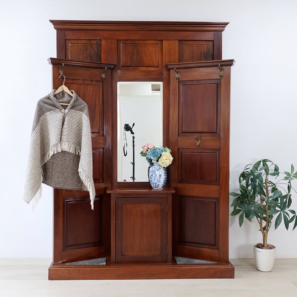 左右に扉を開いた形にデザインされたホールスタンド。中央にはミラーをあしらって、サッと開いた扉の向こう側へと風景が広がるような、華やかな遊び心が感じられるアンティークです。