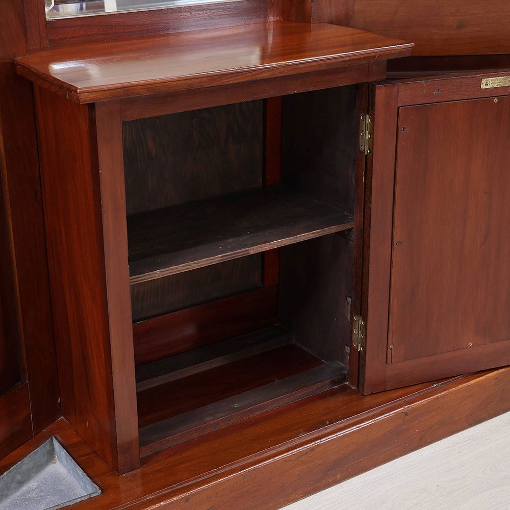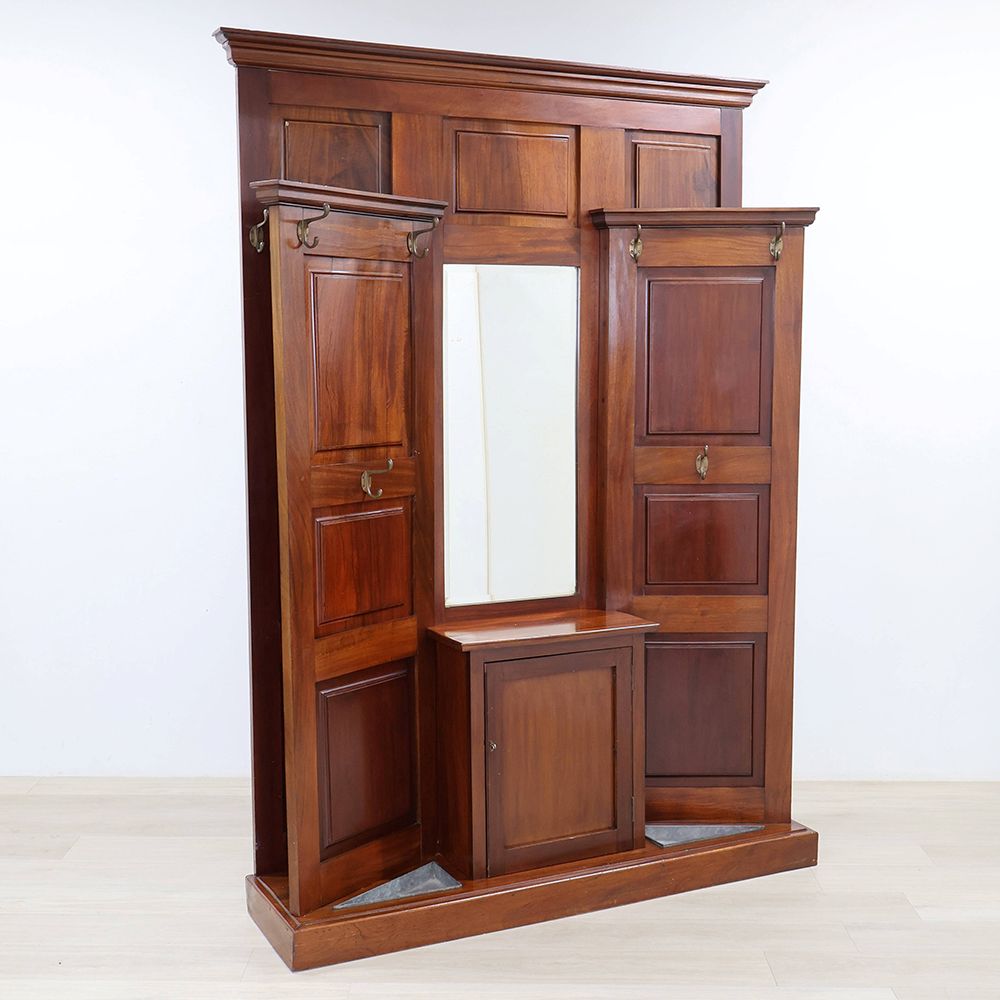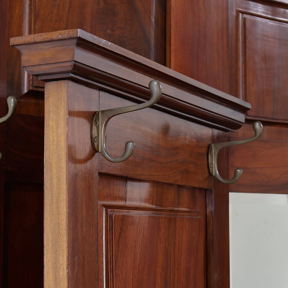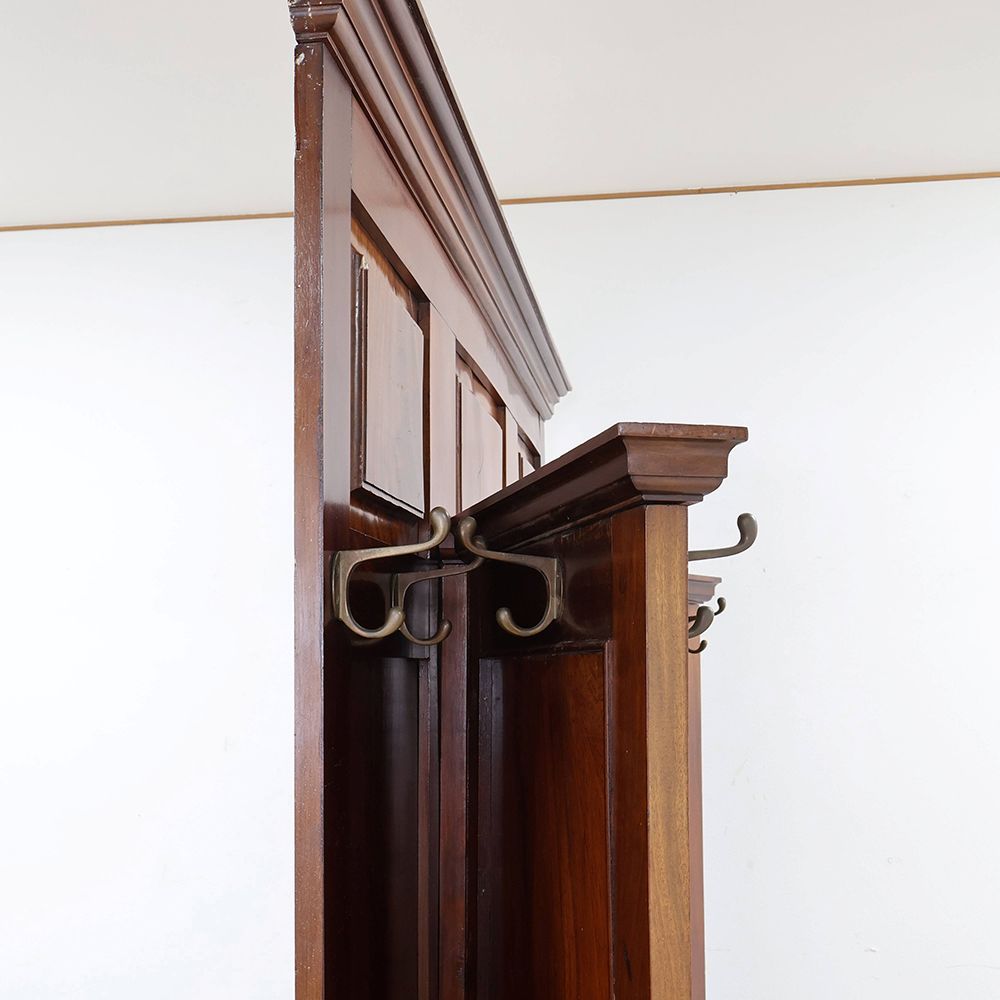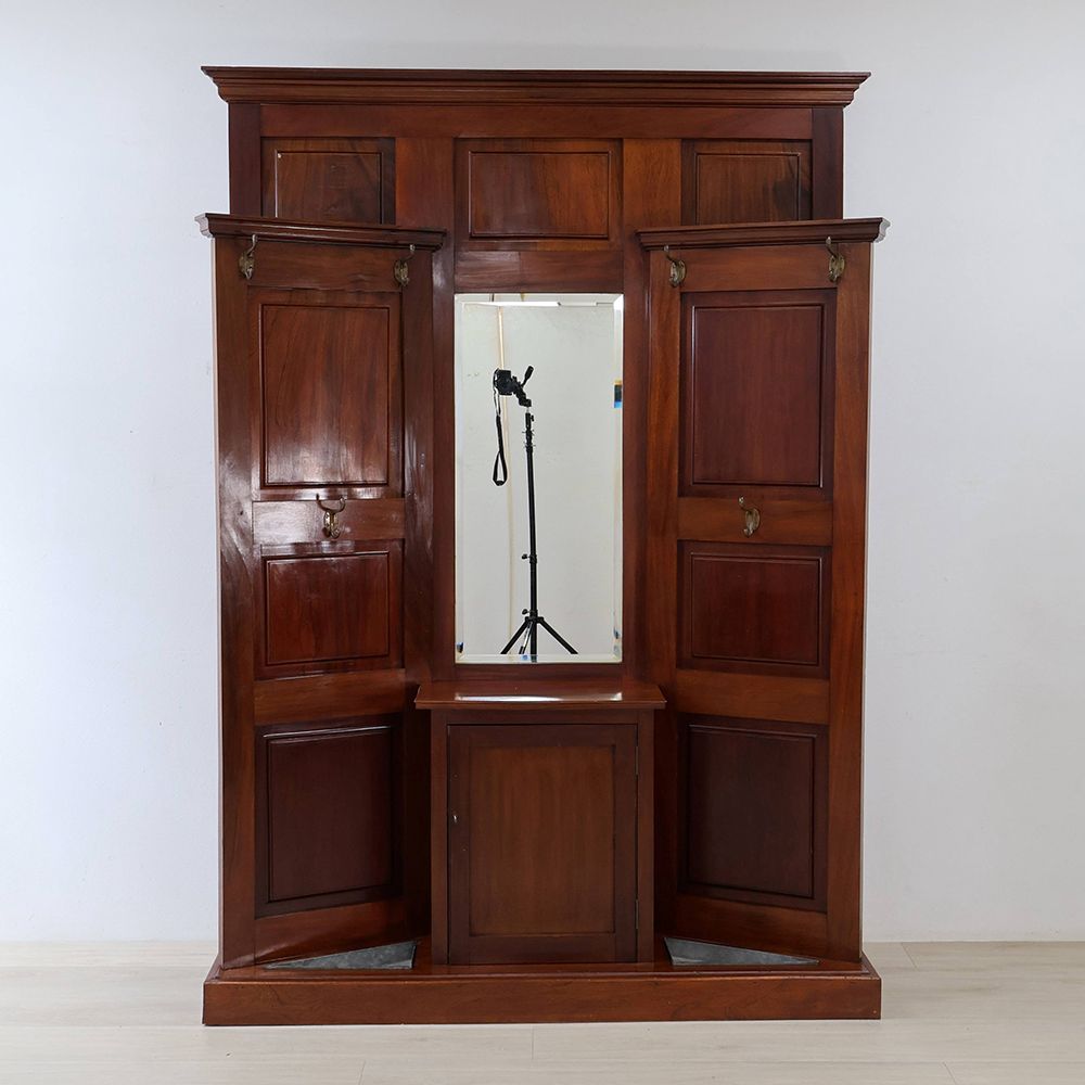 左右に扉を開いた形にデザインされたホールスタンド。中央にはミラーをあしらって、サッと開いた扉の向こう側へと風景が広がるような、華やかな遊び心が感じられるアンティークです。