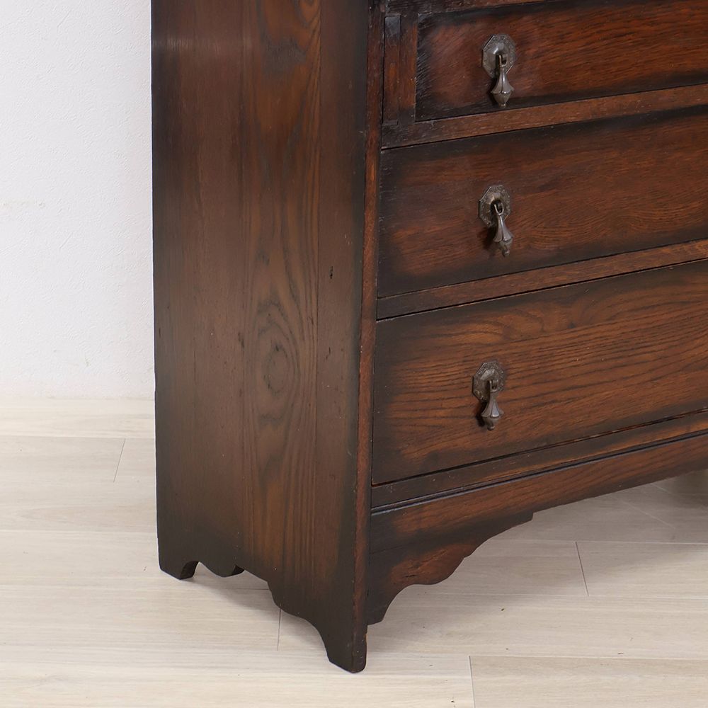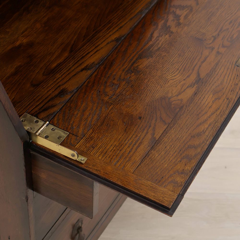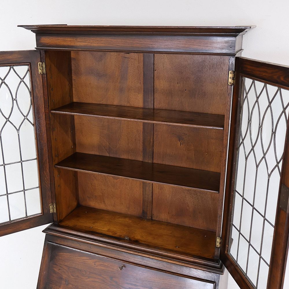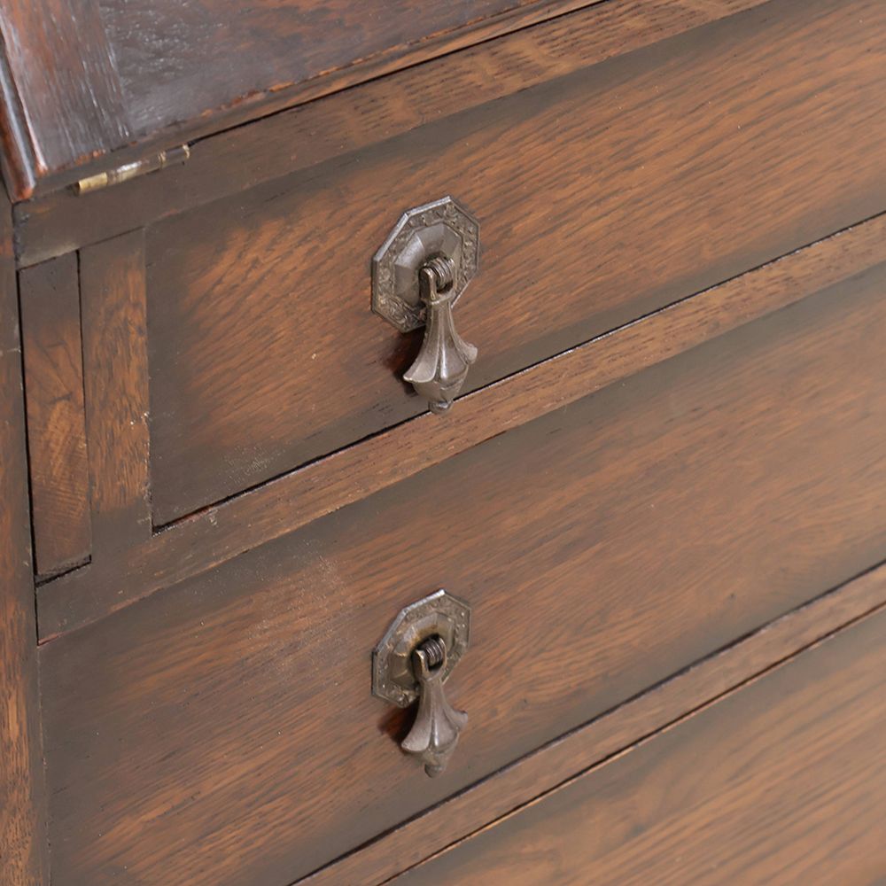 時を経て、ところどころ深い色に染まったオークの風合いも味わい深くて、ウットリと眺めてしまうほど素敵な佇まい。デスクの前に座るたびに、素敵な時間が始まる予感に心ときめきくアンティーク・ビューローブックケースです。