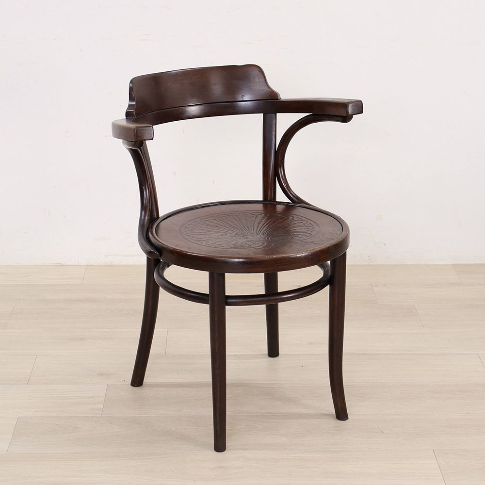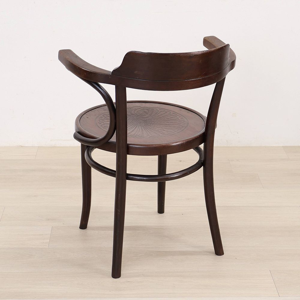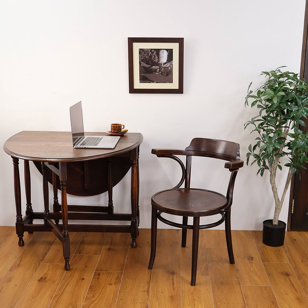 曲木をあしらったベントウッドチェアらしいデザインながら、落ち着いた佇まい。シックな空間によく似合うアンティークです。