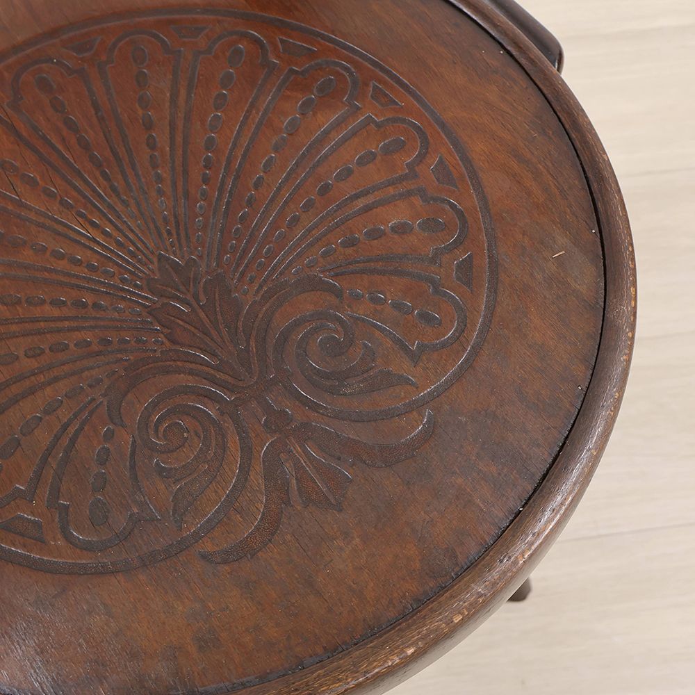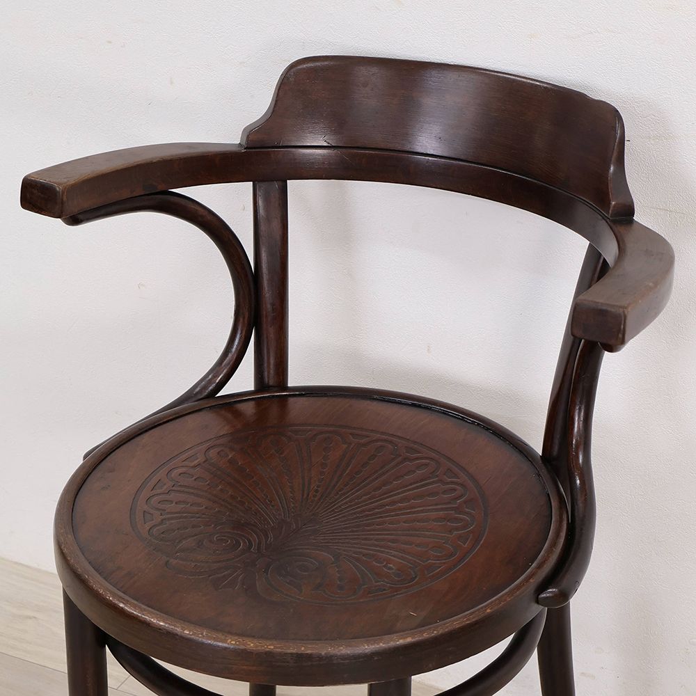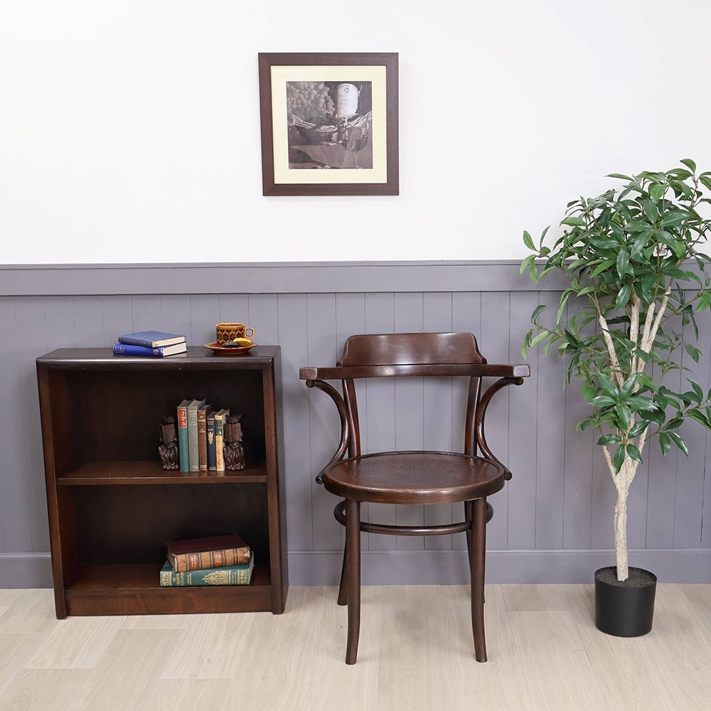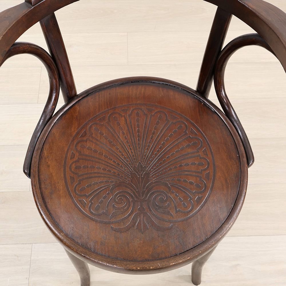 曲木をあしらったベントウッドチェアらしいデザインながら、落ち着いた佇まい。シックな空間によく似合うアンティークです。