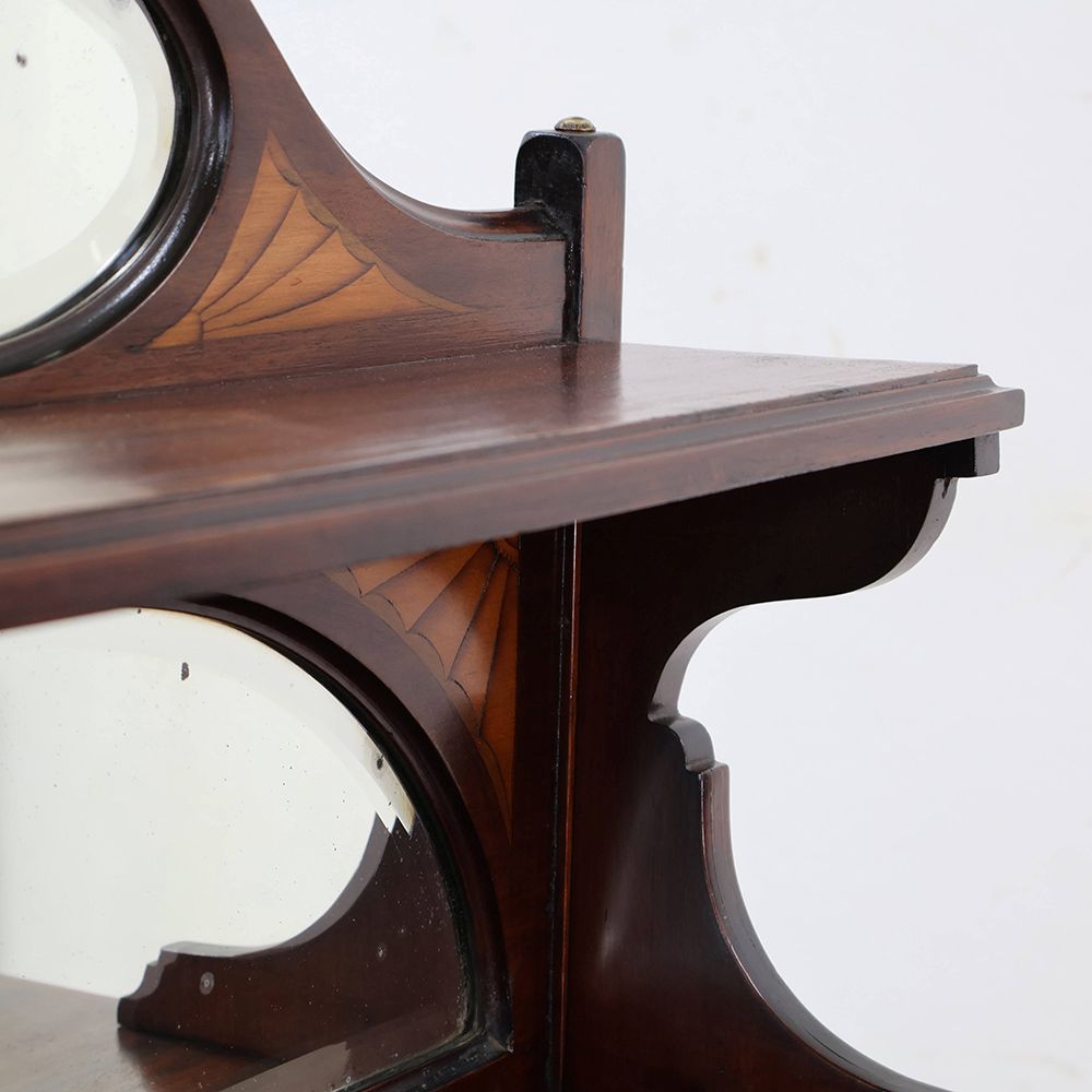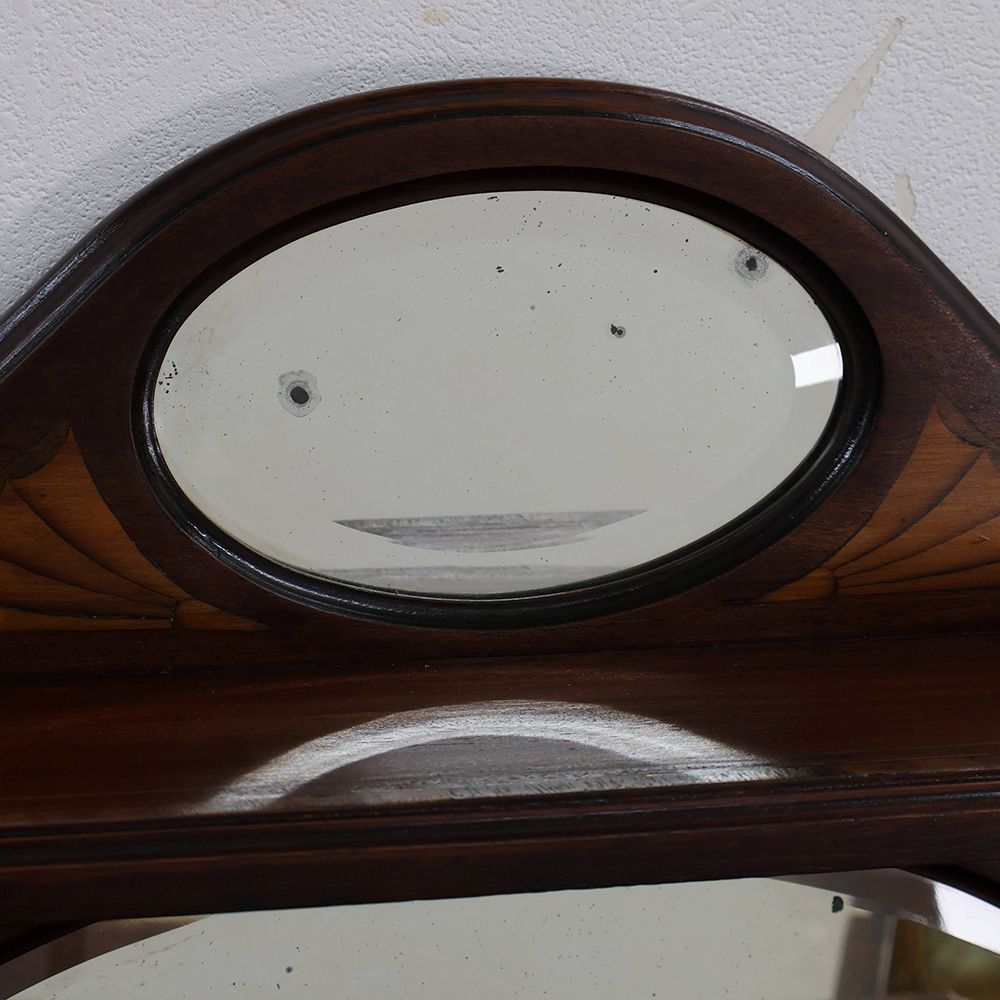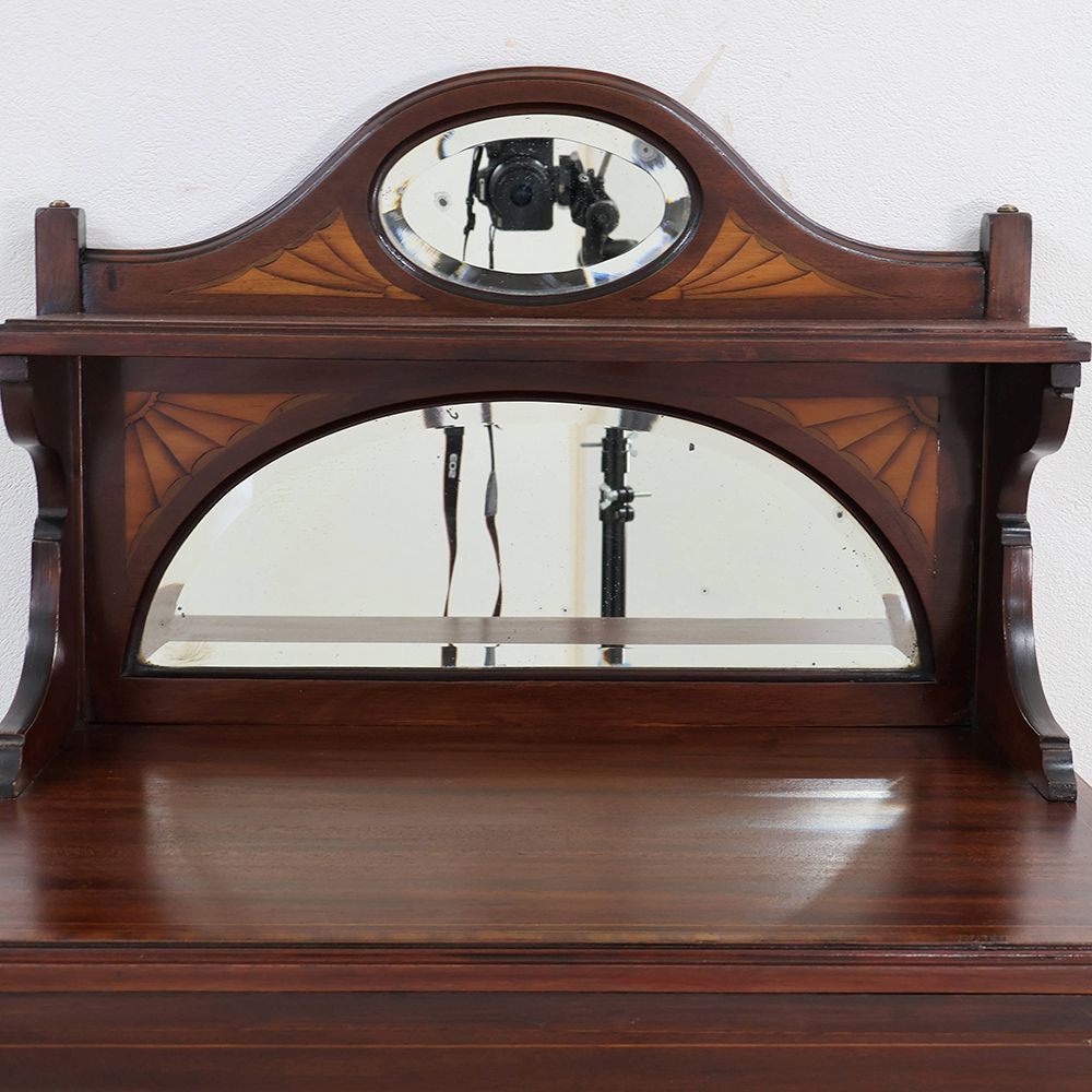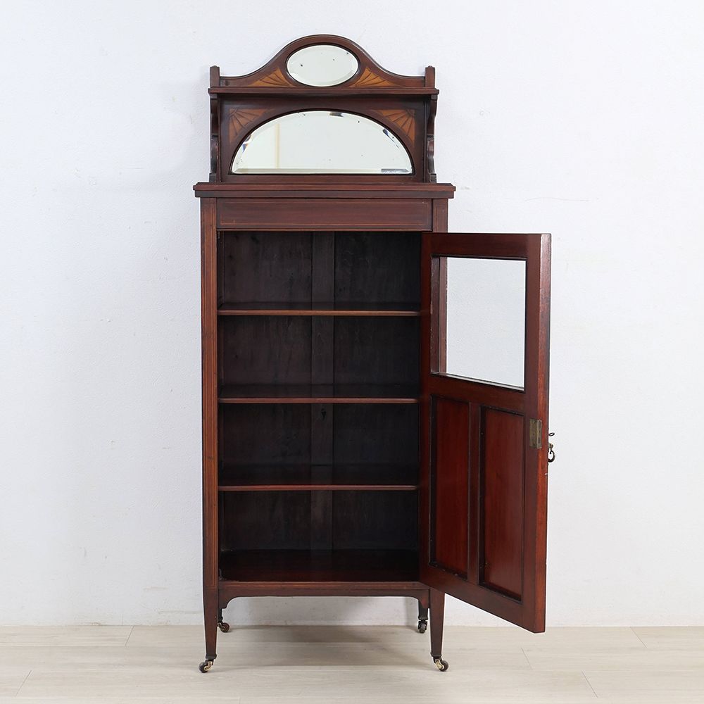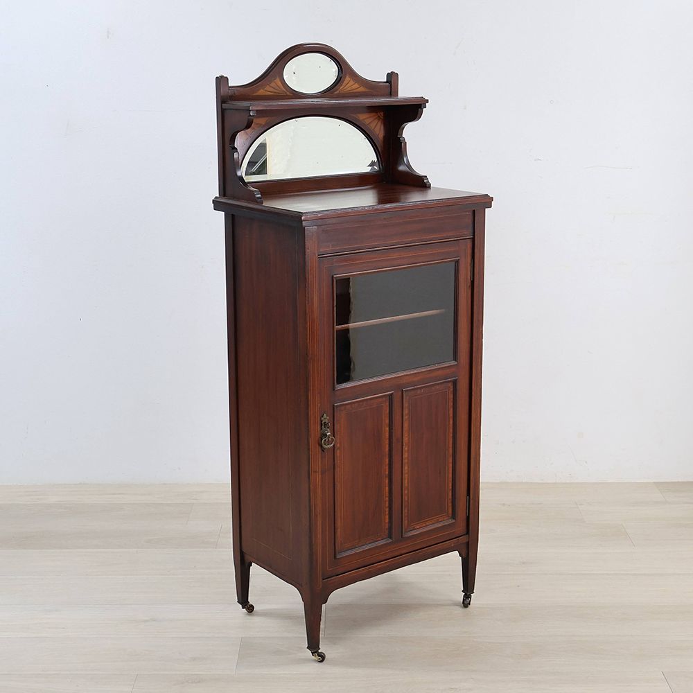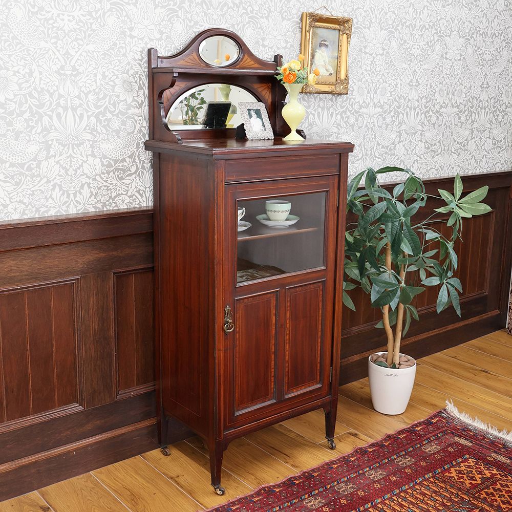 トップにオーバル型と半円型のミラーがキラリと輝く、オシャレなアンティークキャビネットが入荷しました。