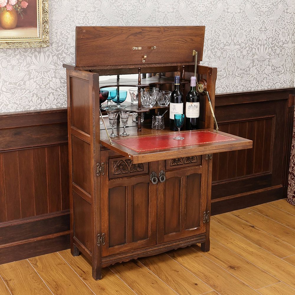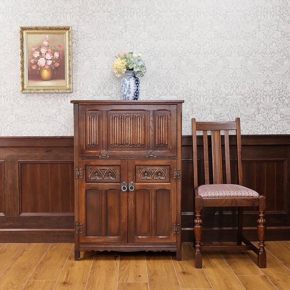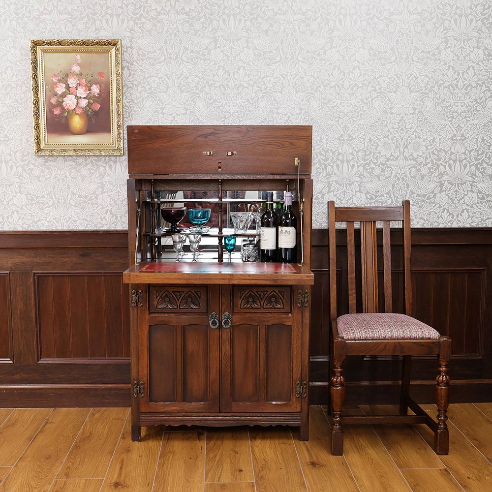 伝統的な彫りの彫刻を凝らしたカクテルキャビネットは、イギリスで古くから愛され続けてきたチューダースタイル。扉を開くと、扉奥に組み込まれたミラーや棚に並べたグラスが光を反射して、その眩さに驚きます。