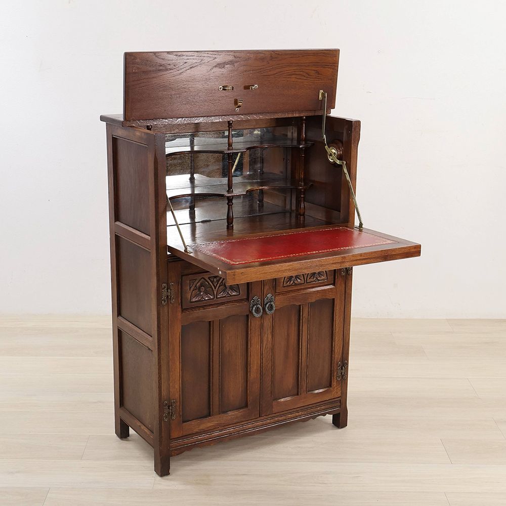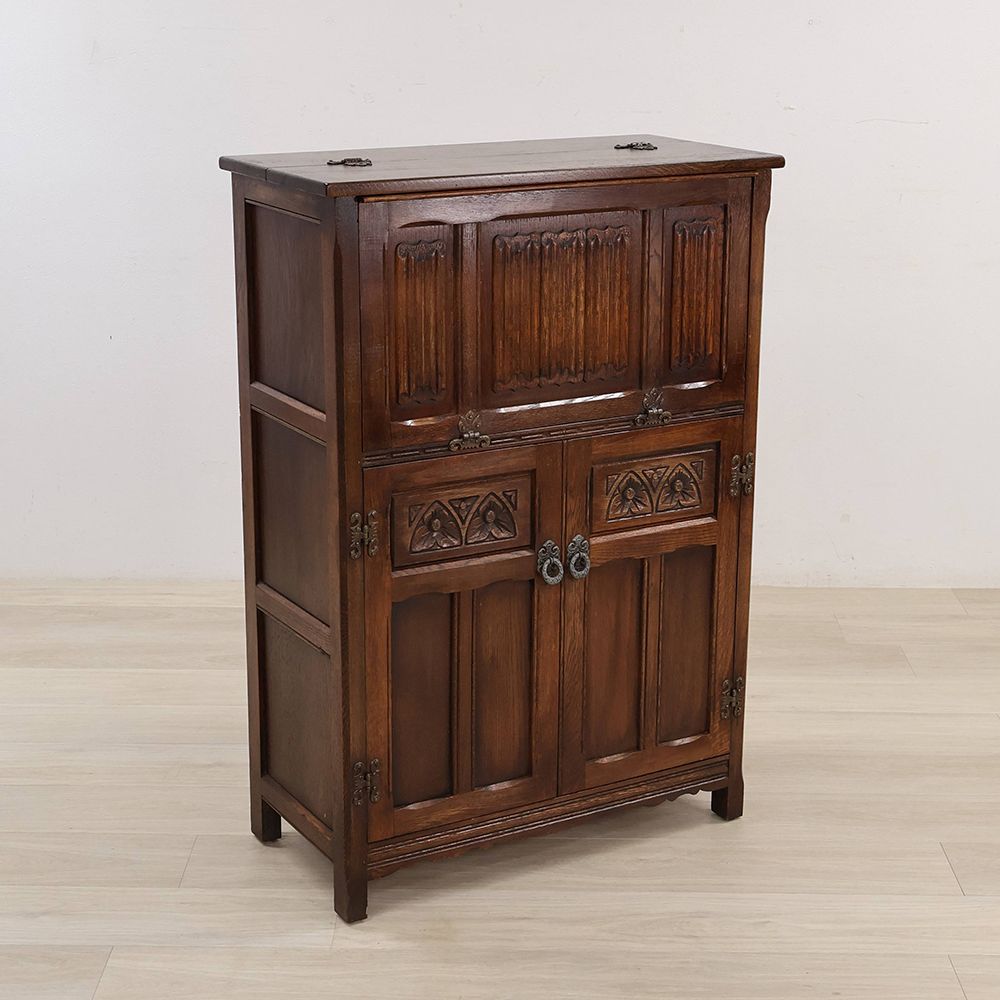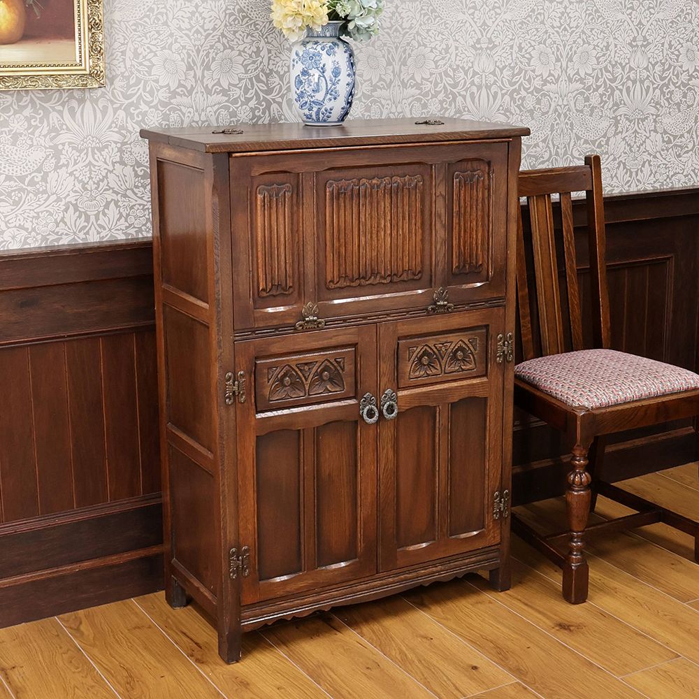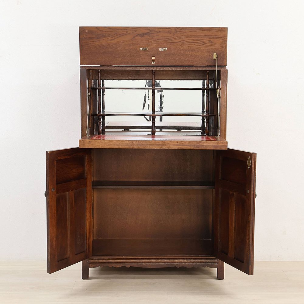 伝統的な彫りの彫刻を凝らしたカクテルキャビネットは、イギリスで古くから愛され続けてきたチューダースタイル。扉を開くと、扉奥に組み込まれたミラーや棚に並べたグラスが光を反射して、その眩さに驚きます。