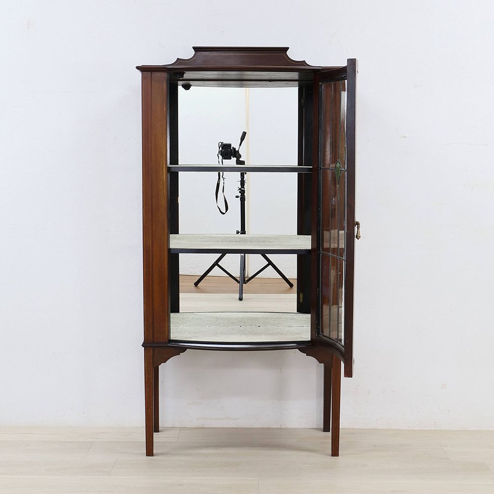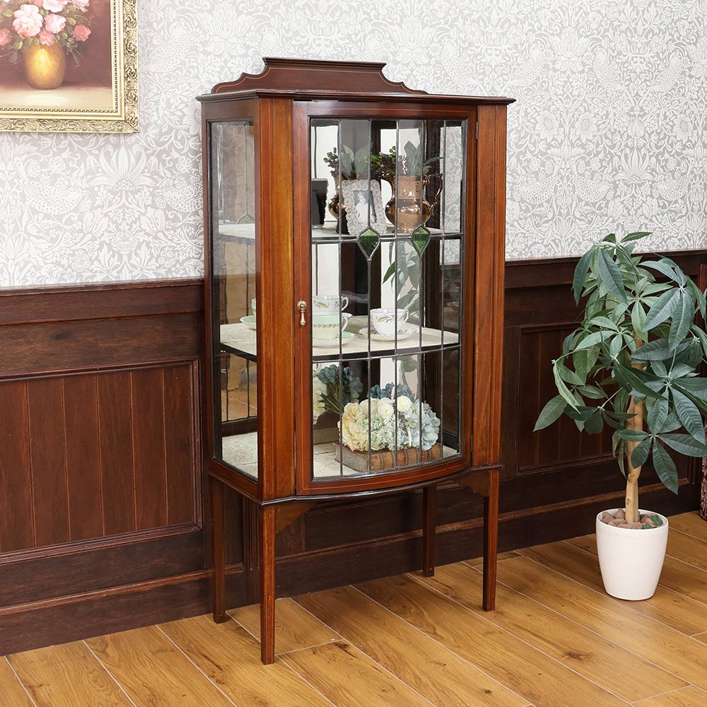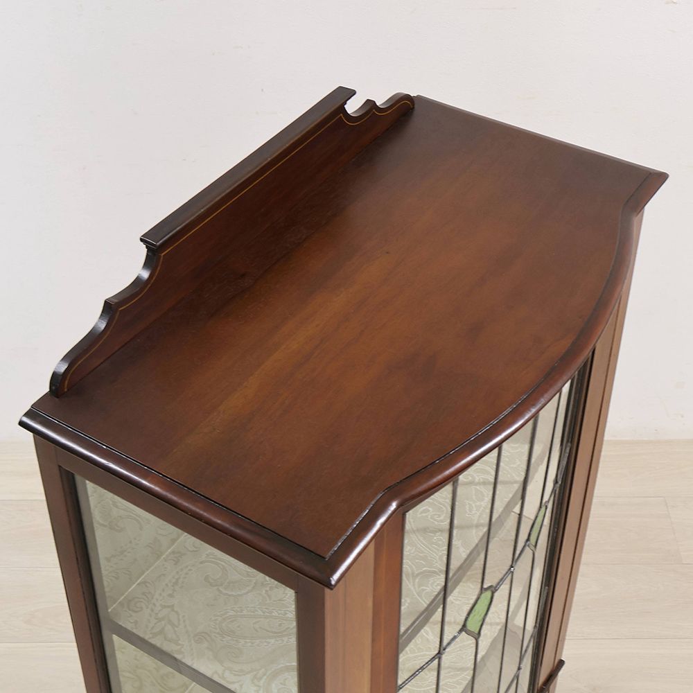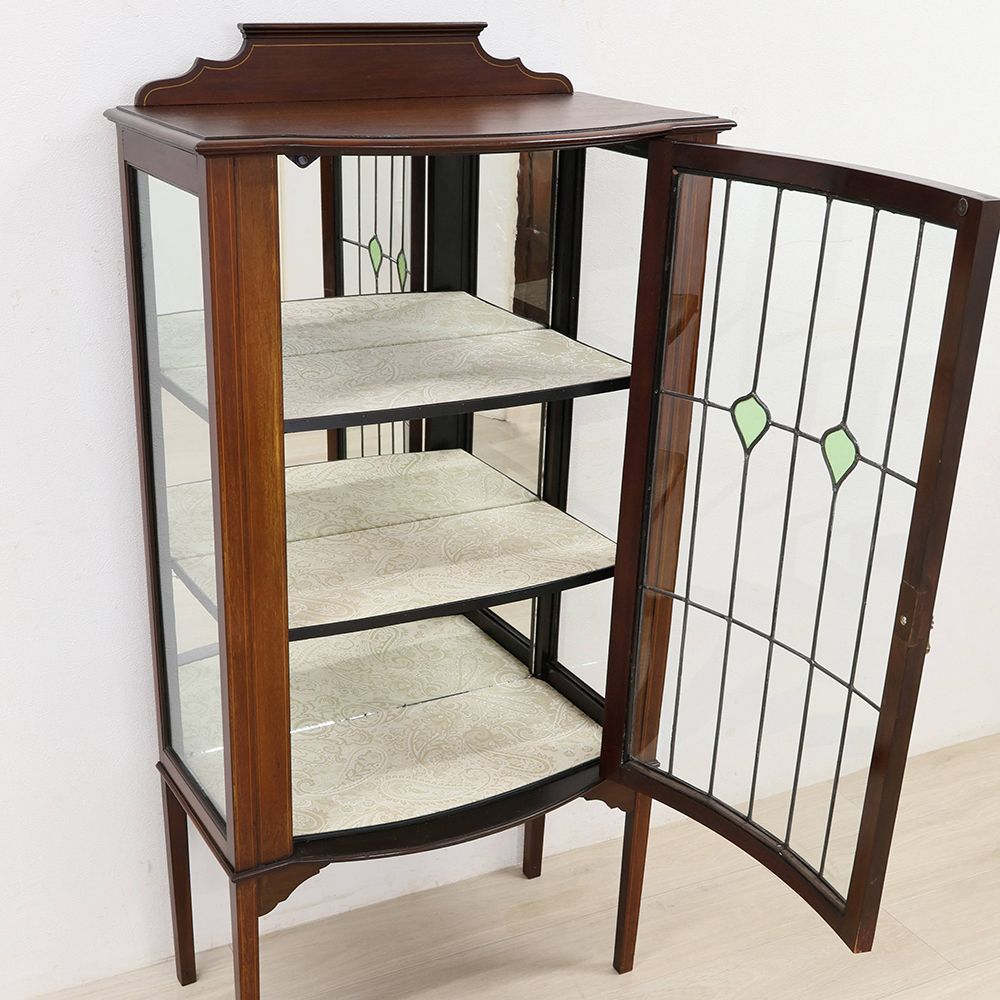 扉はグリーンのガラスがアクセントになったステンドグラス。キャビネット奥に張り込まれたミラーとステンドグラスが光を反射して、キラキラと華やぐような明るさが視線を惹き寄せる、オシャレなディスプレイキャビネット。