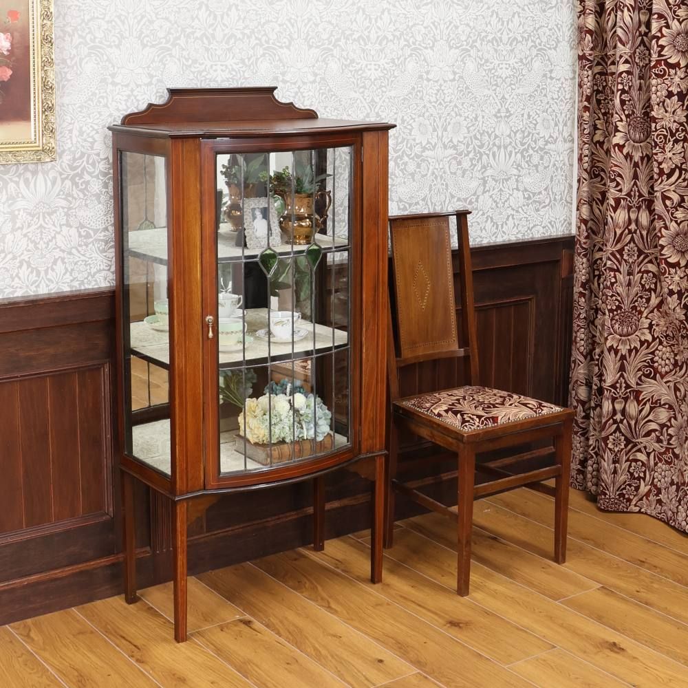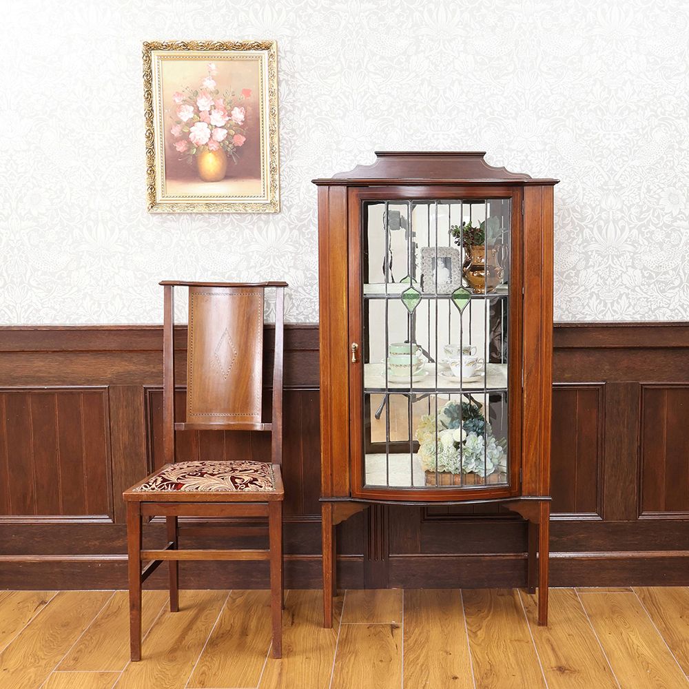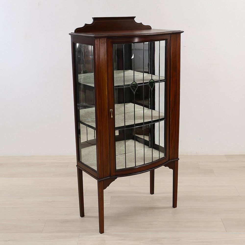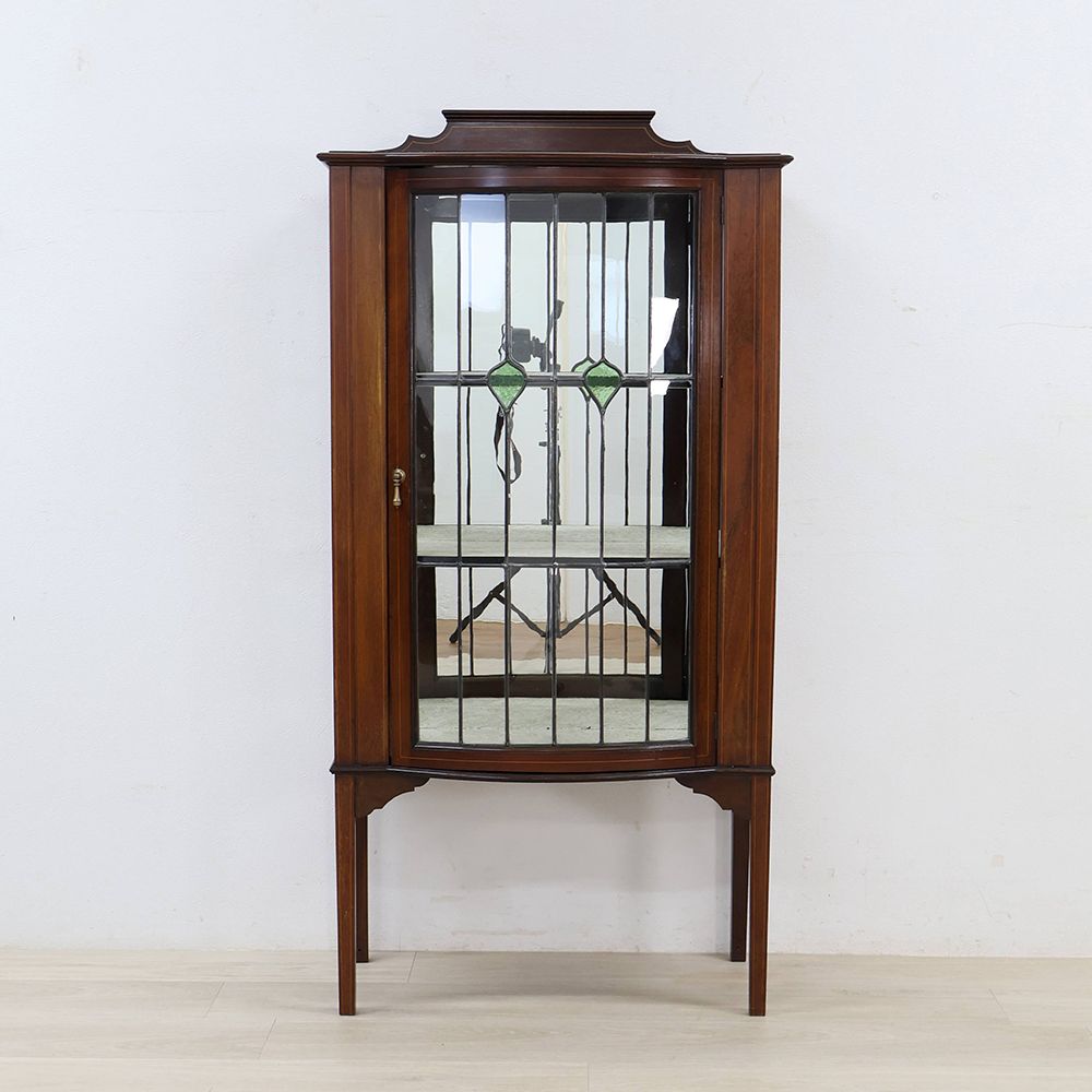 扉はグリーンのガラスがアクセントになったステンドグラス。キャビネット奥に張り込まれたミラーとステンドグラスが光を反射して、キラキラと華やぐような明るさが視線を惹き寄せる、オシャレなディスプレイキャビネット。