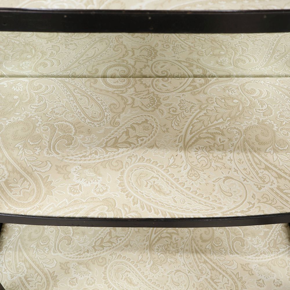 キャビネット内の棚は、刺繍でペイズリー柄をあしらったエレガントなファブリックが張り込まれています。
