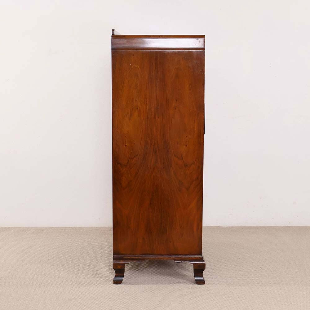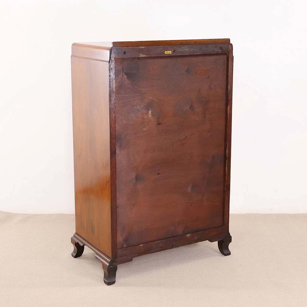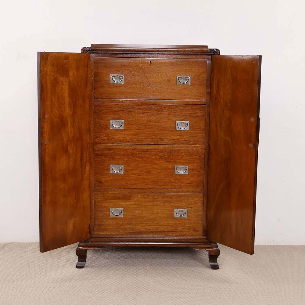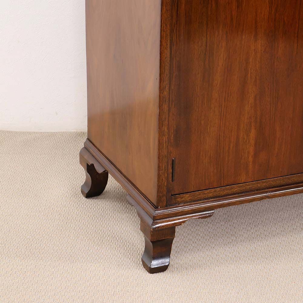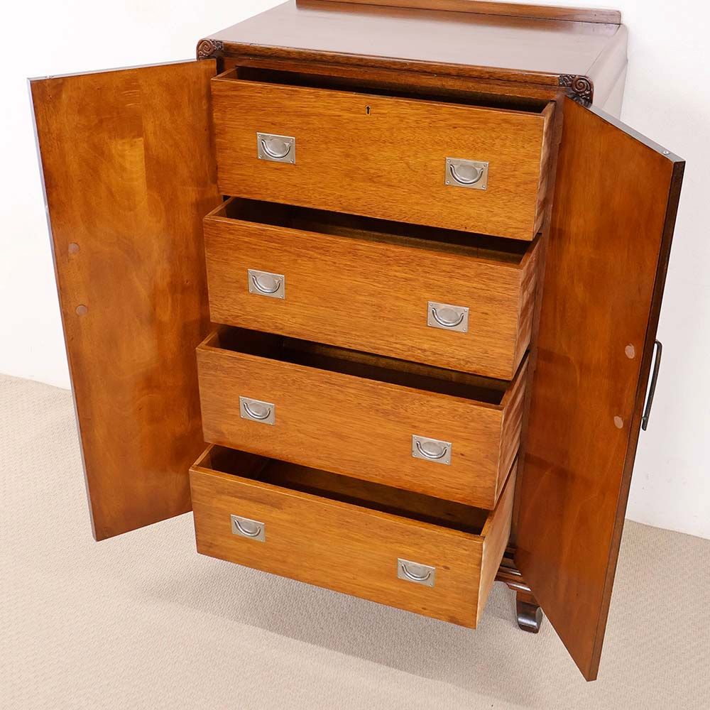 高級家具に用いられるマホガニー材を贅沢に用いたチェストキャビネットは、形の良い脚や彫りの装飾に昔ながらの伝統が感じられるのですが、扉のハンドルだけはアールデコ調のモダンデザイン。