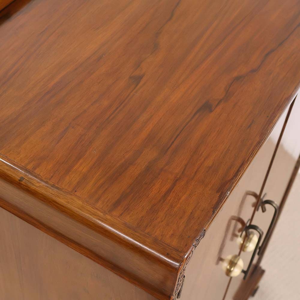 「チェストキャビネットって何かしら?」と考えながら扉を開けてみたら、扉内には引出が並んでいて「確かにチェストキャビネットですね」と納得。スッキリとした形ながらトップの角に、ささやかに花の装飾をあしらった、素敵なアンティークです。