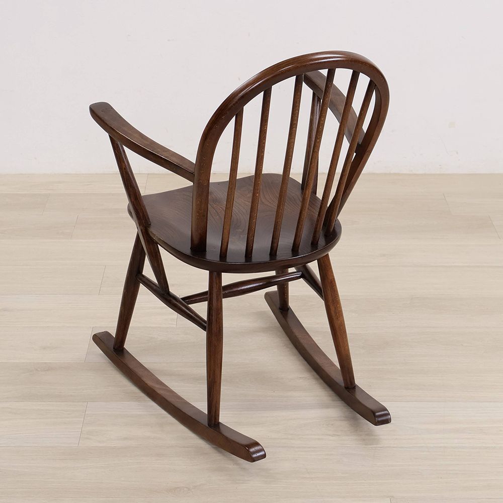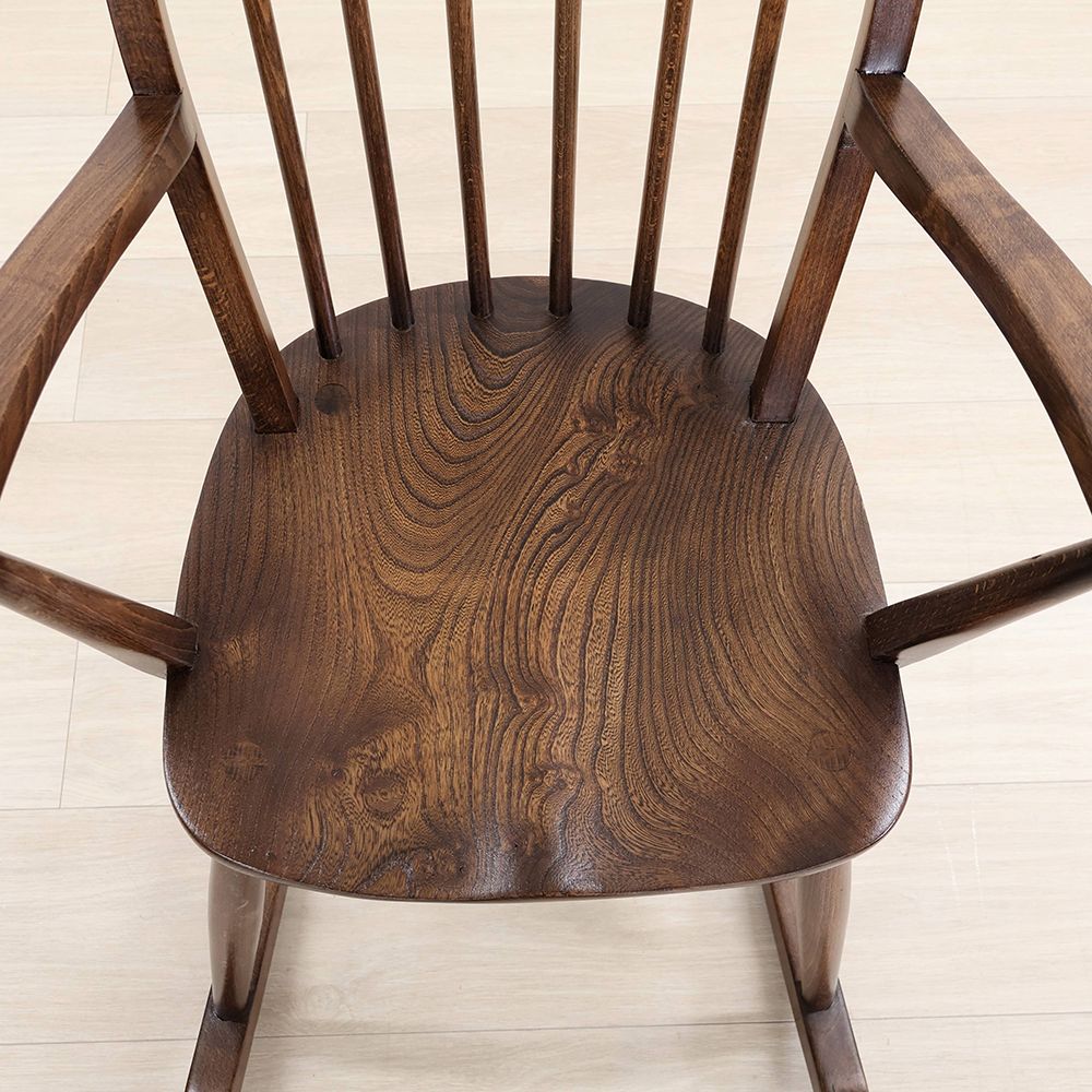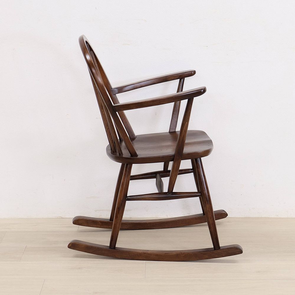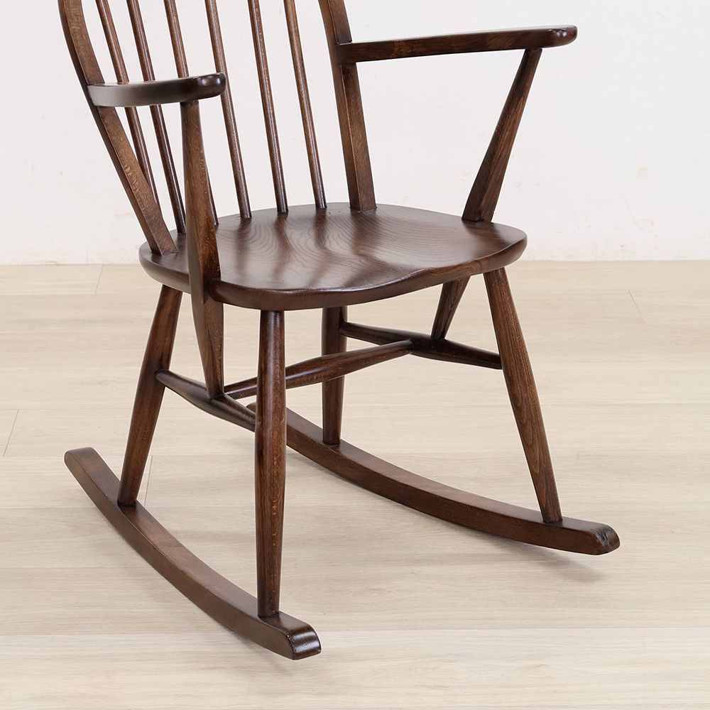 優しいブラウン色が素敵なこのロッキングチェアは、アームや座面はツヤツヤの深い色。きっとたくさん座って磨かれてきたのでしょう。使われてきた長い時間に物語を感じる味わい深い風合いが素敵です。
