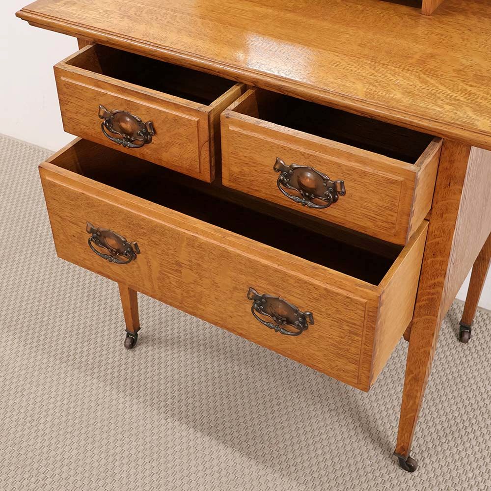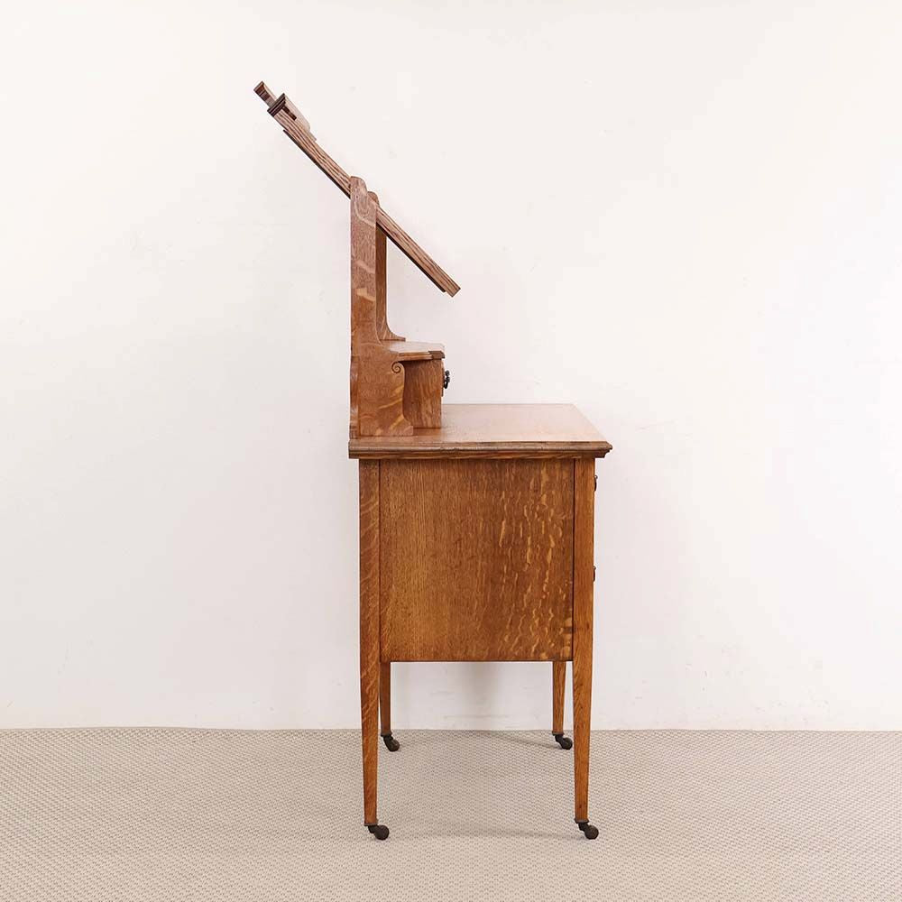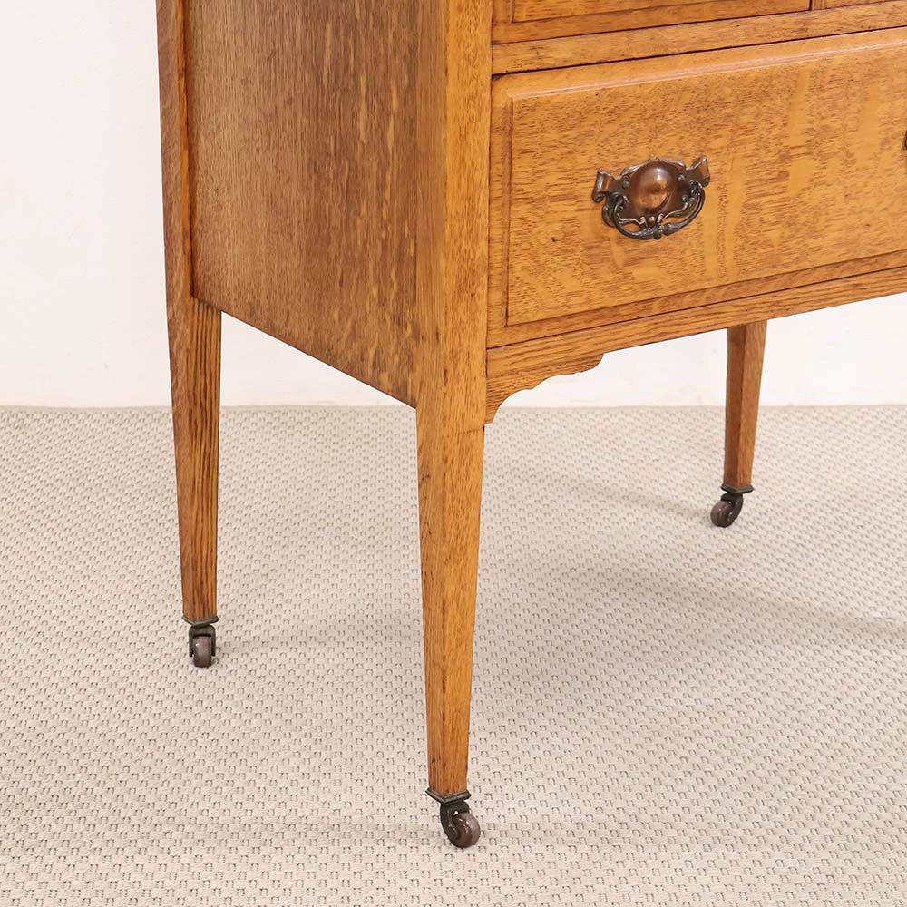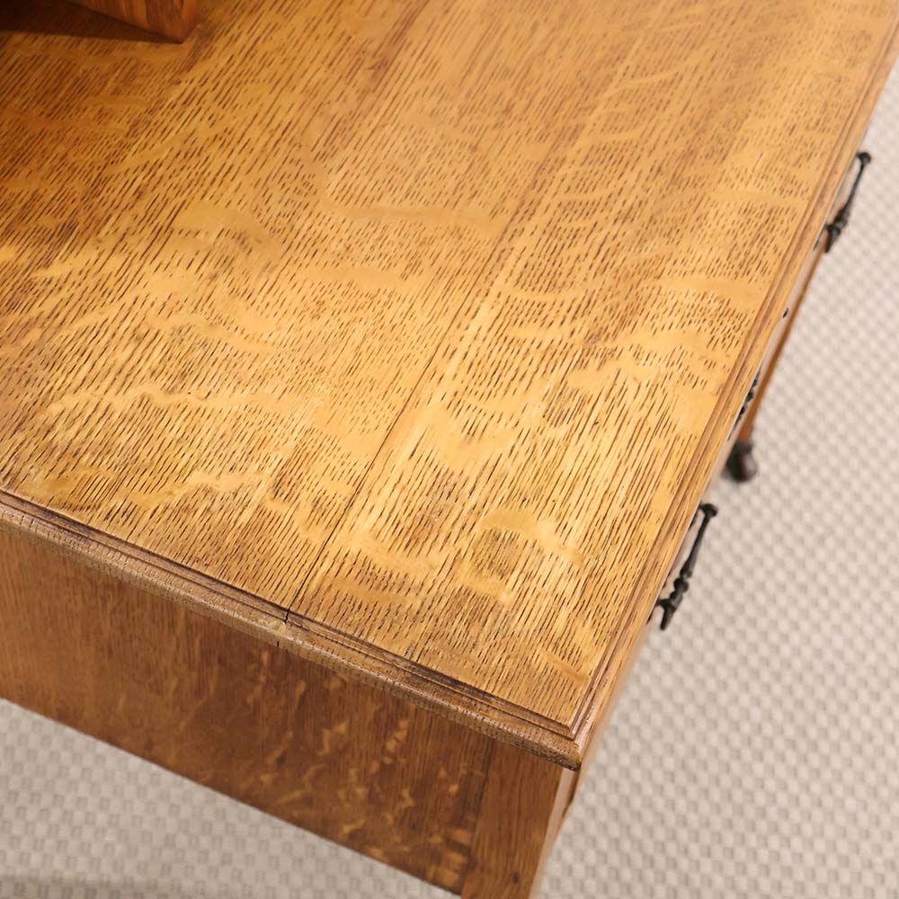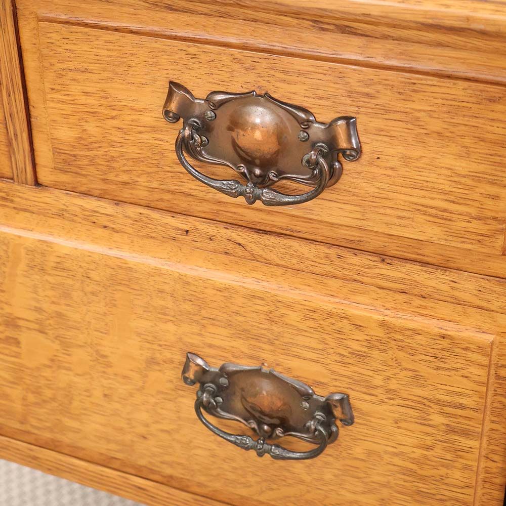 ナチュラルな色のオークの引出には、やわらかな褐色に染まったハンドルがアクセント。きっと1930年代当時は華やかに輝いていたであろう金色も、大きな戦争と長い年月を経て、味わい深い表情を見せてくれています。
