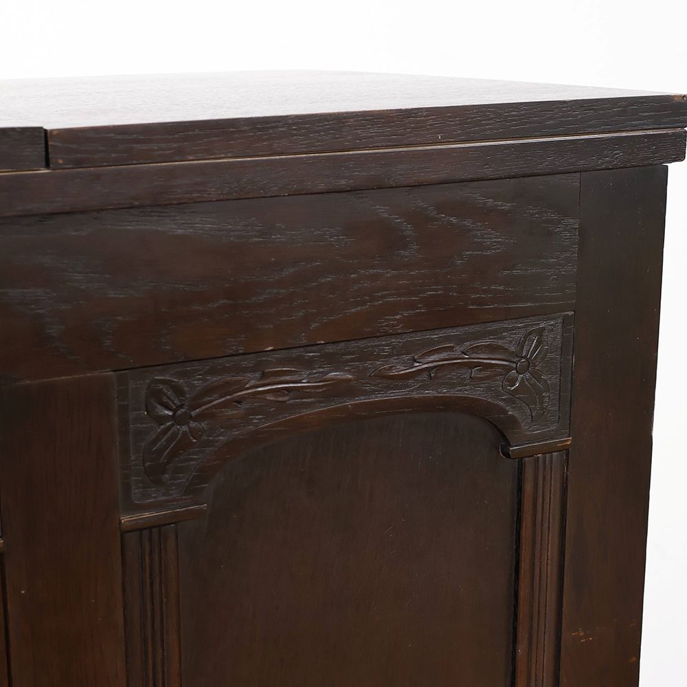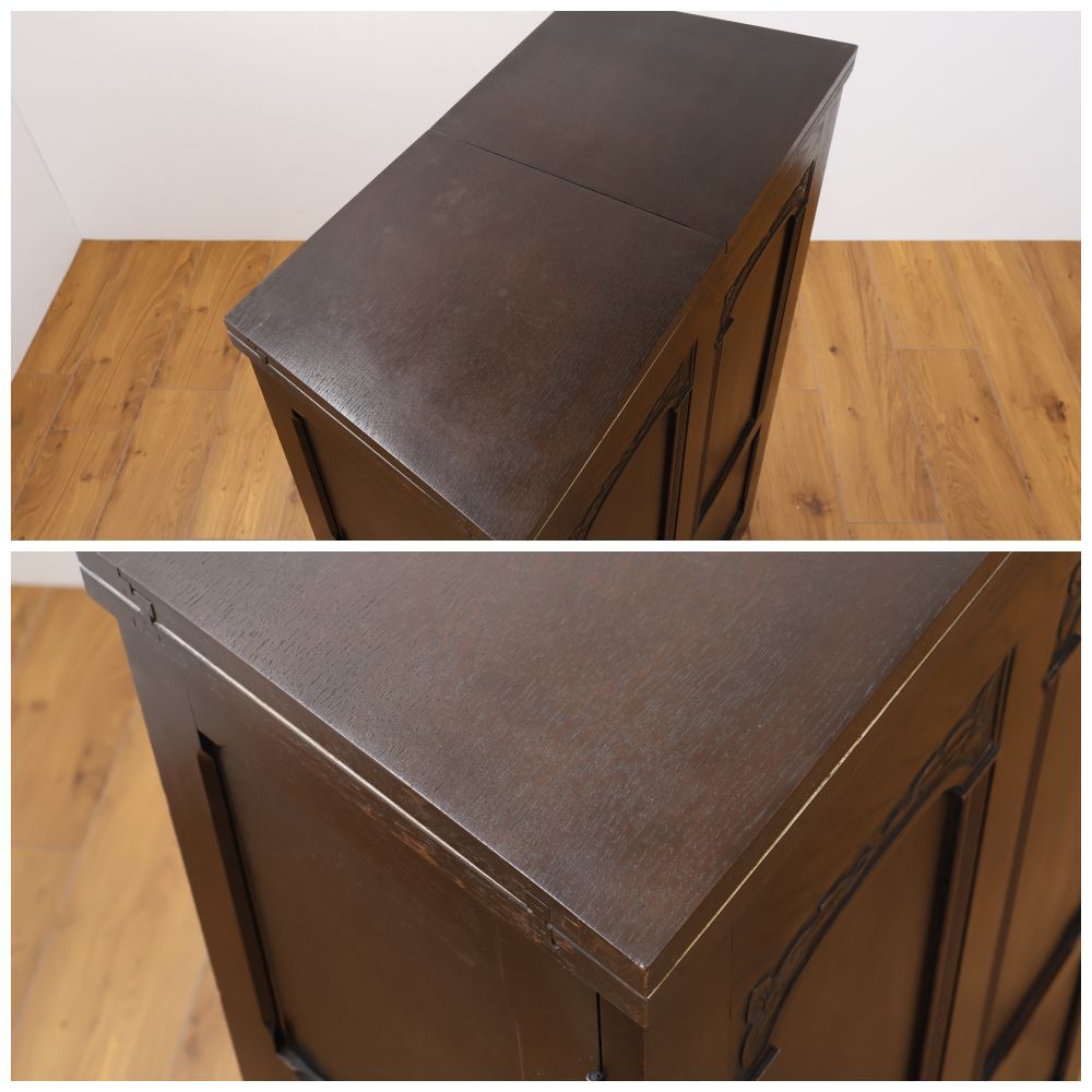 正面に彫りの装飾をあしらったカウンターは、驚きの折りたたみ式。