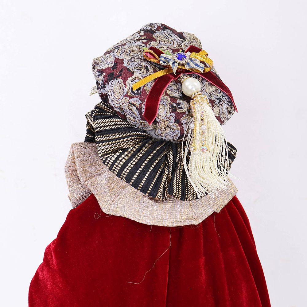 ローズ色のマントには多くのパールが装飾されたブレードがつき、ブーツや衣装にはラインストーンが施され煌びやかな仕上がりのサンタクロース人形です。