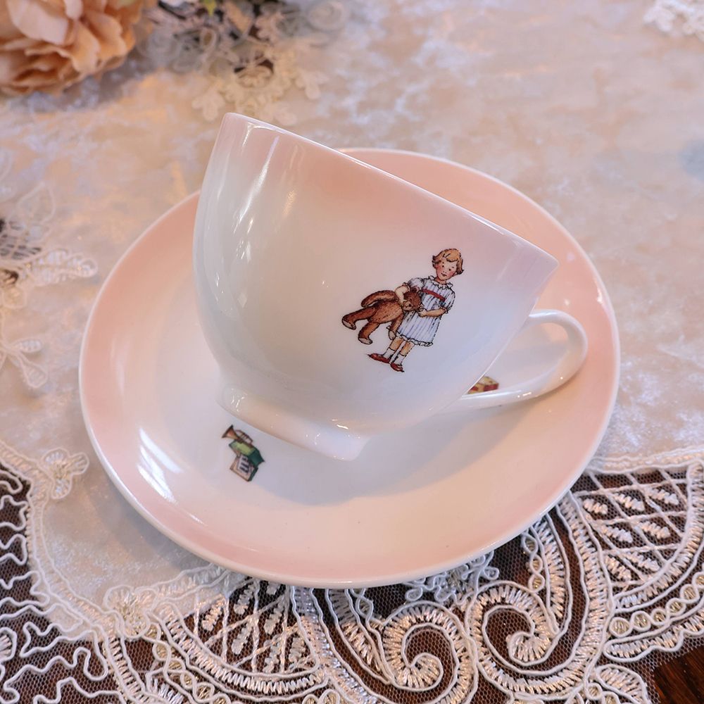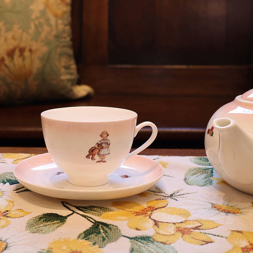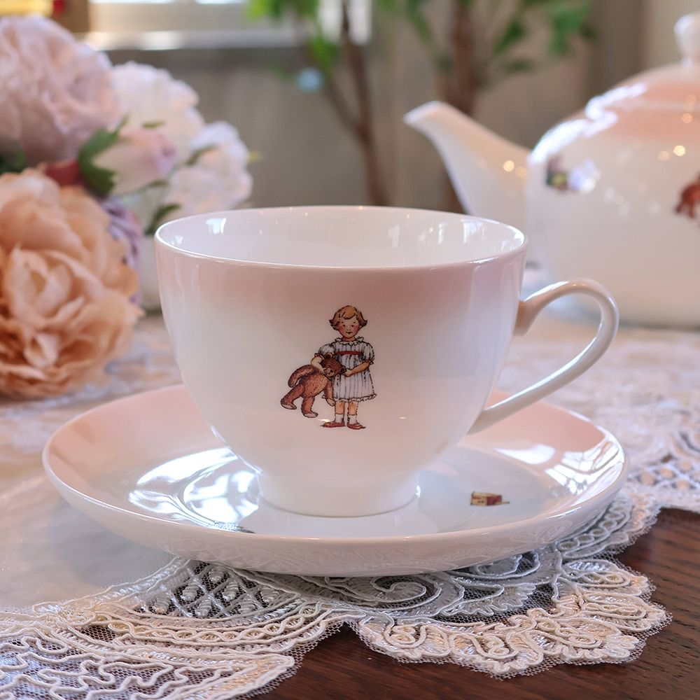 カップの中央に描かれたのは、大切そうにテディベアを抱きしめる小さな女の子。その愛らしい佇まいを眺めているだけで、ふっと心がほどけていくような温もりに包まれますね。