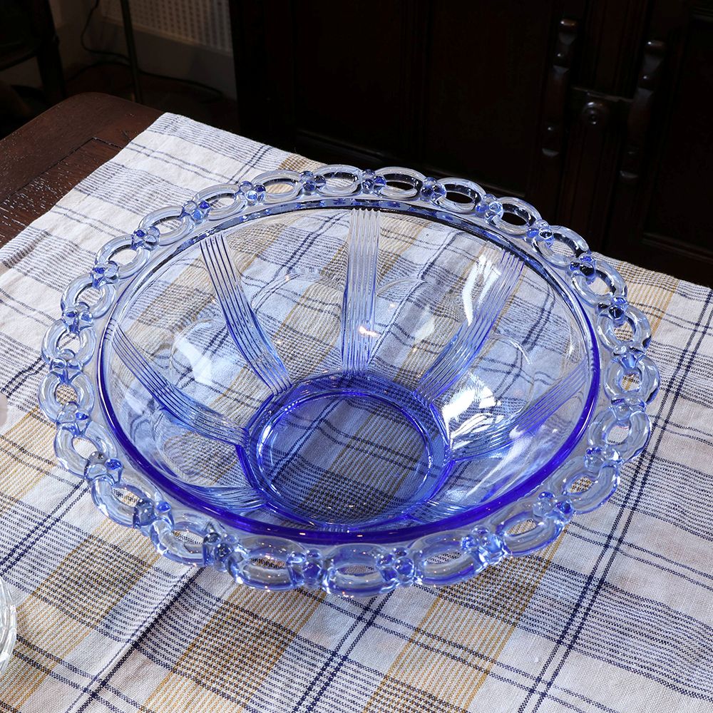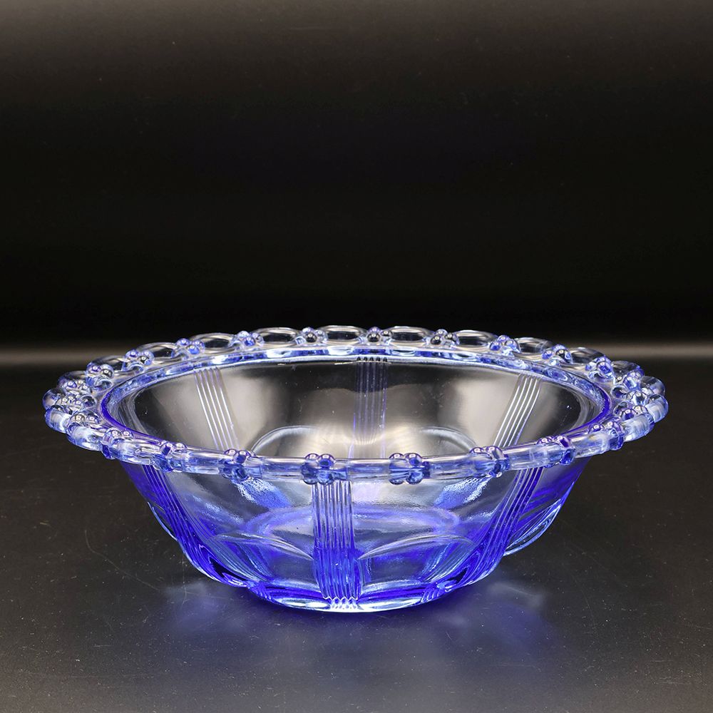 編み模様のような縁取りと放射状にラインを入れた、オシャレなガラスボウルです。