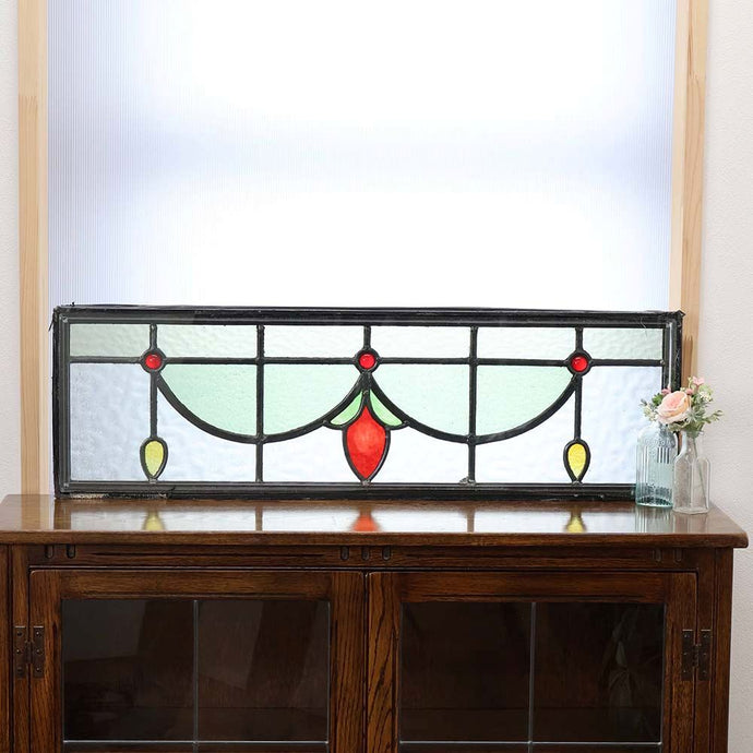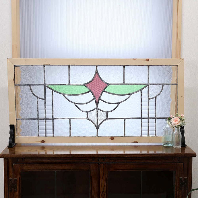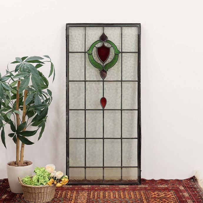 赤とグリーンが彩る英国アンティークステンドグラス(保護ガラス付) VC114-079001