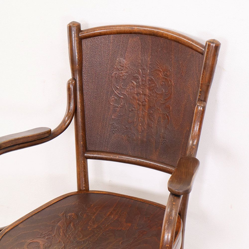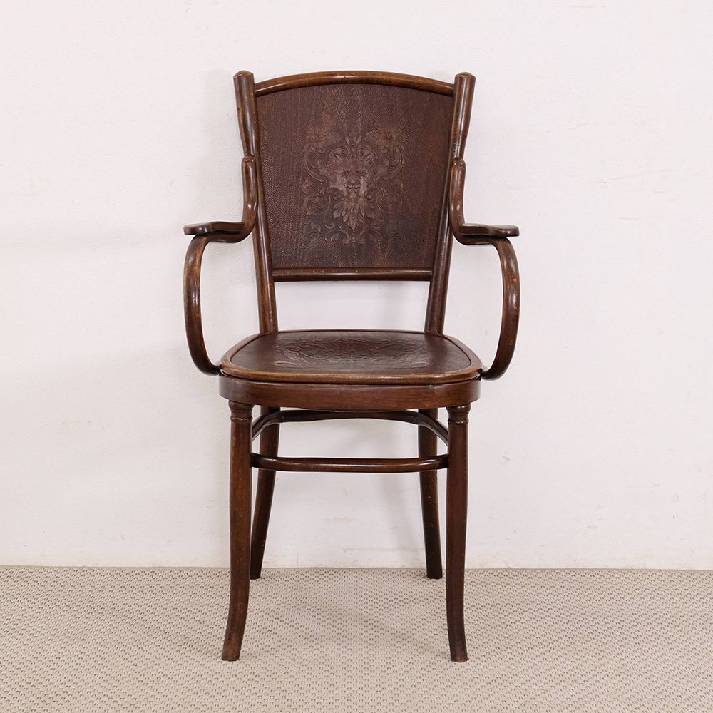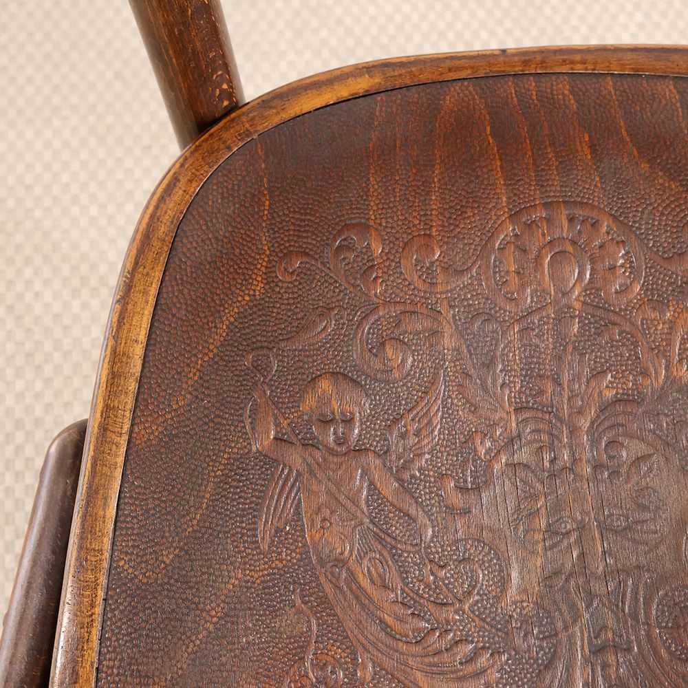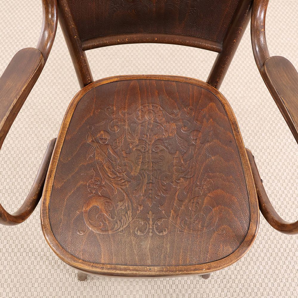 このベントウッドアームチェアの背板と座面には、天使に捕らわれた邪神(?)とも思われる顔があしらわれて、とても印象的。