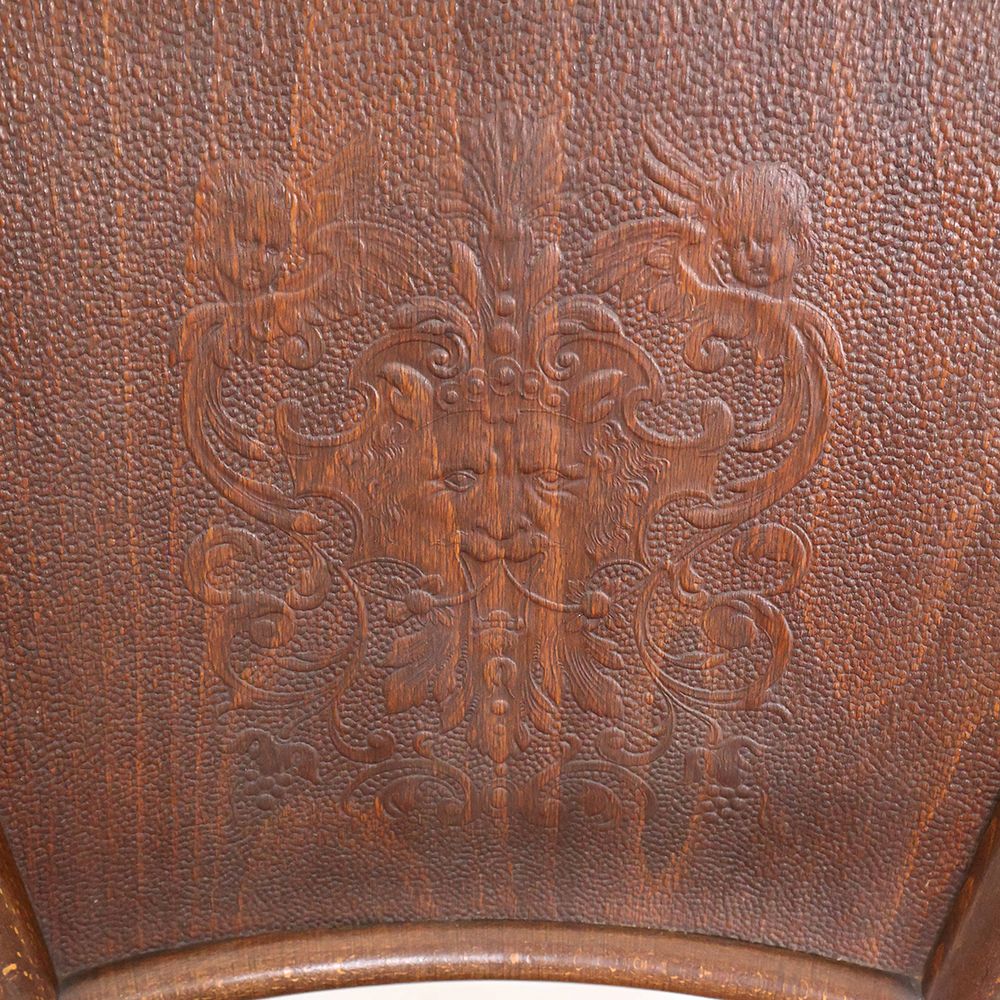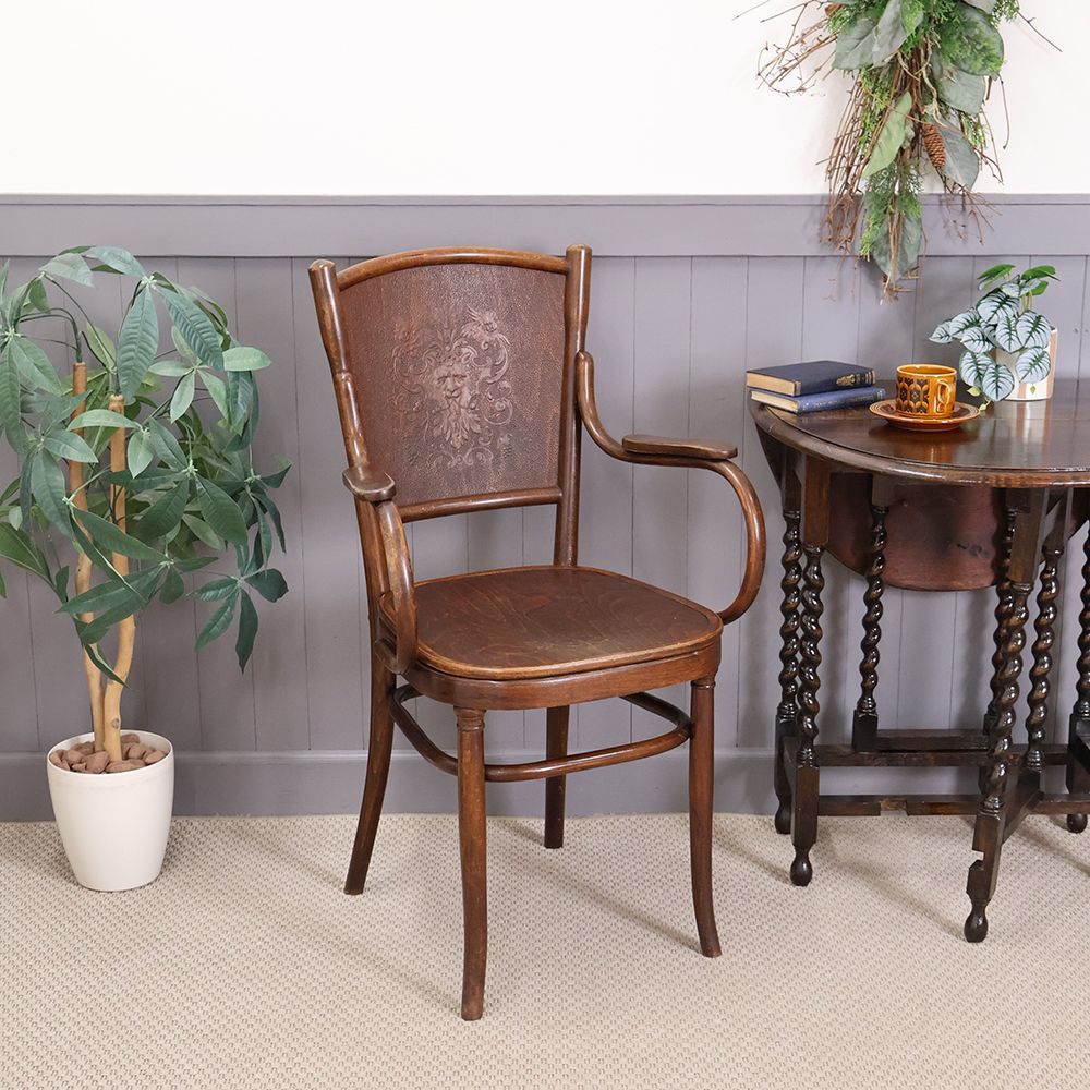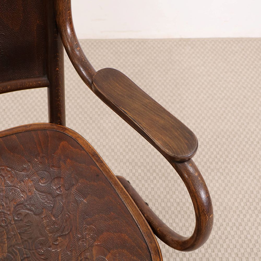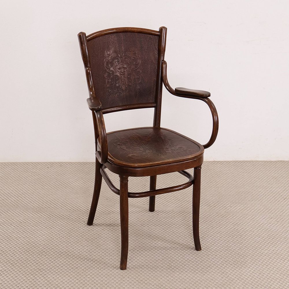 このベントウッドアームチェアの背板と座面には、天使に捕らわれた邪神(?)とも思われる顔があしらわれて、とても印象的。