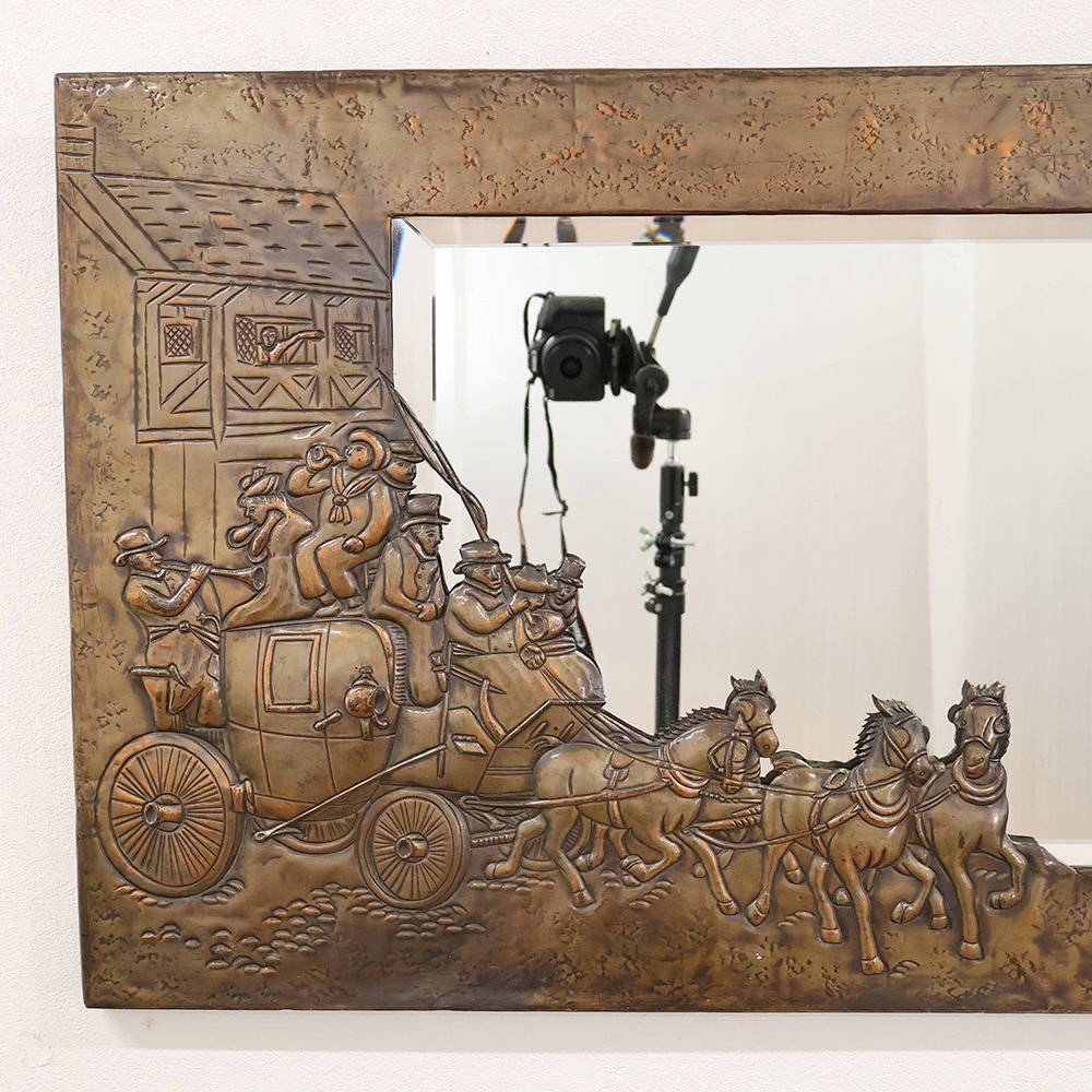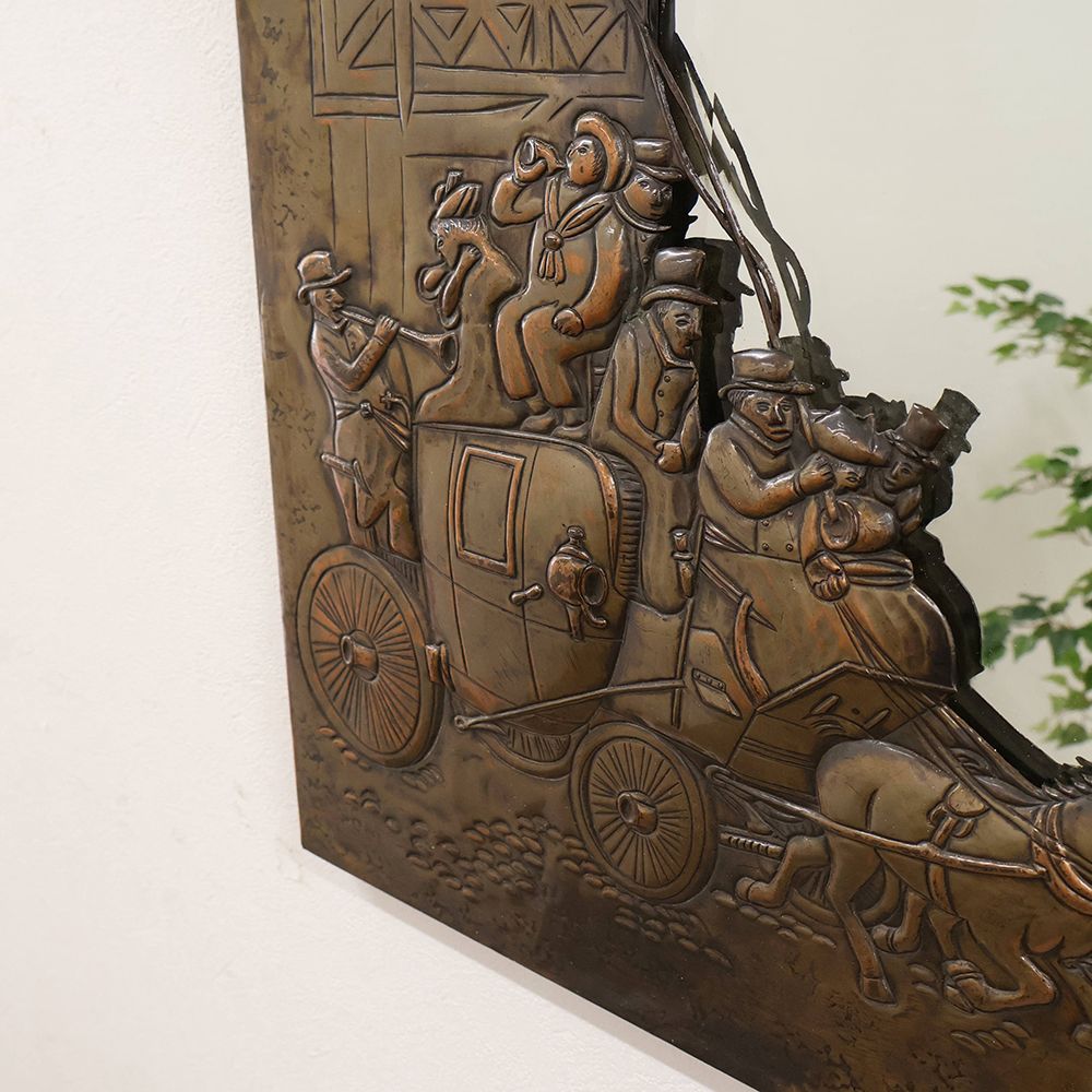 フレームの左下に、人が溢れるほど乗った馬車を立体的にあしらったウォールミラーは、一度見たら忘れられなくなるほど個性的。