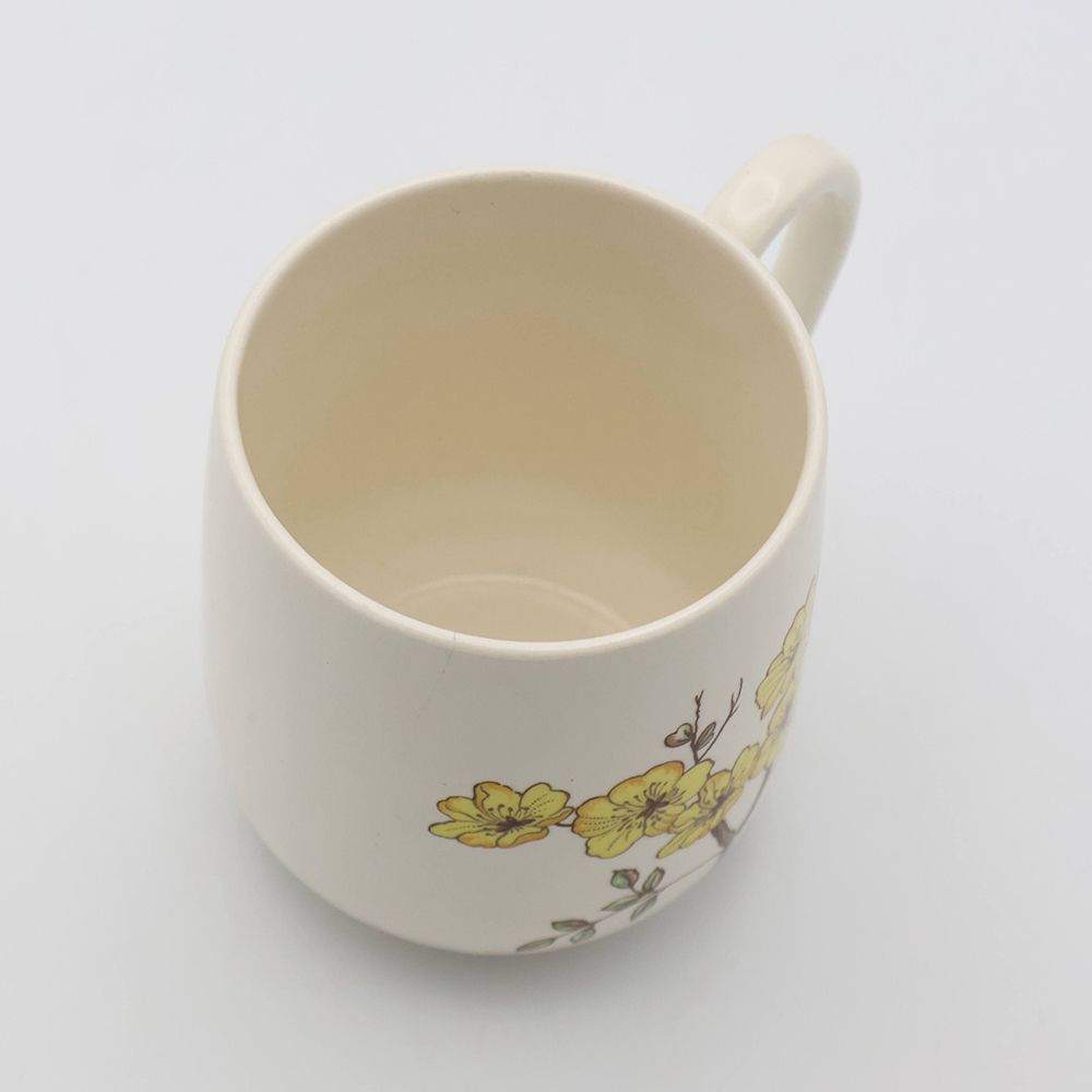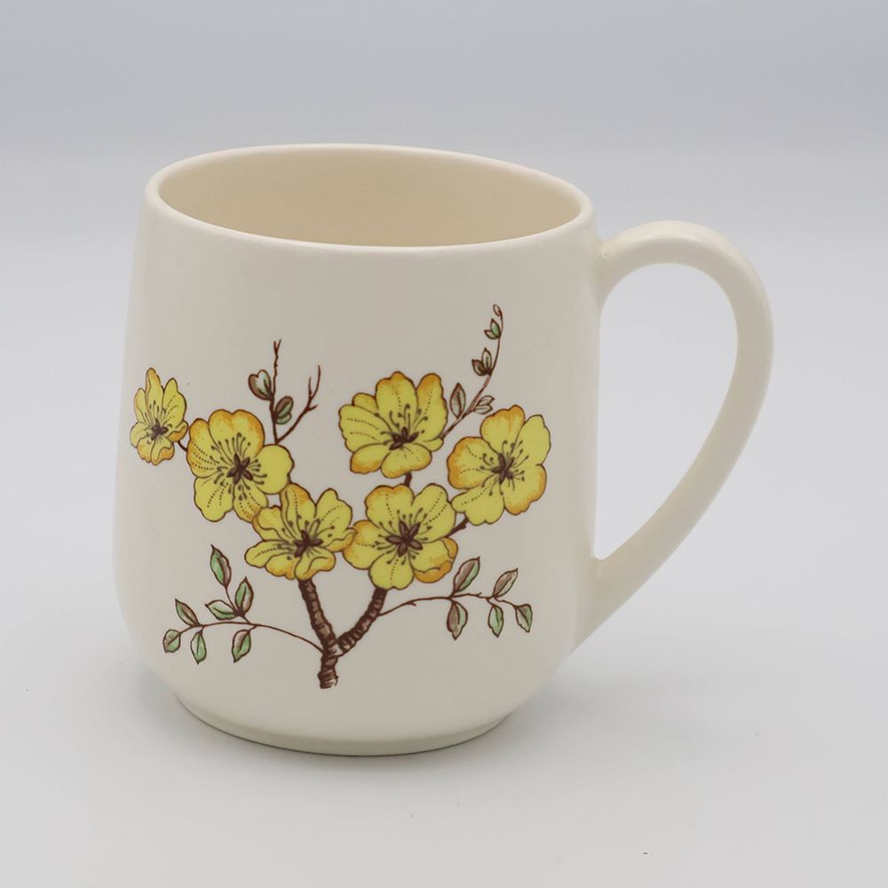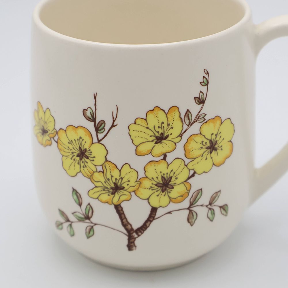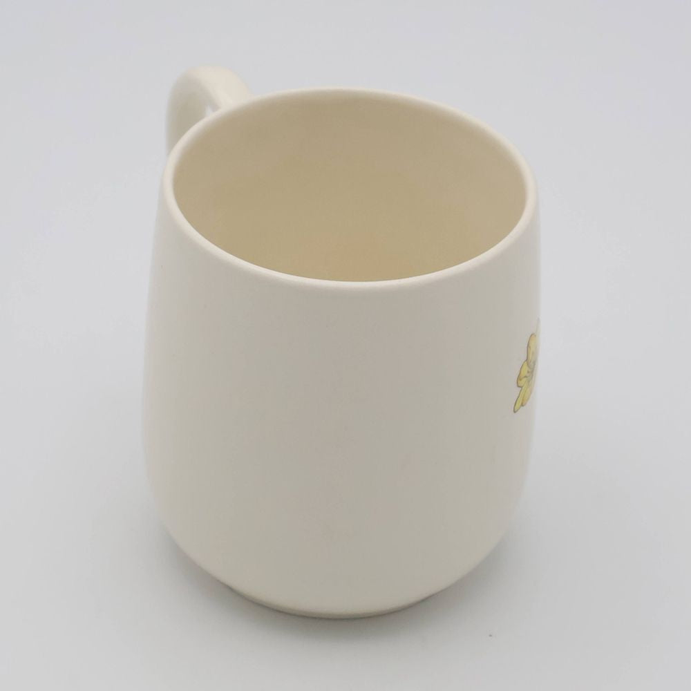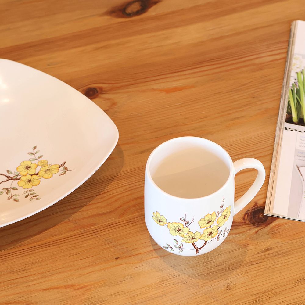 黄色いミモザの花がふんわりと咲いた、あたたかみのあるマグ。